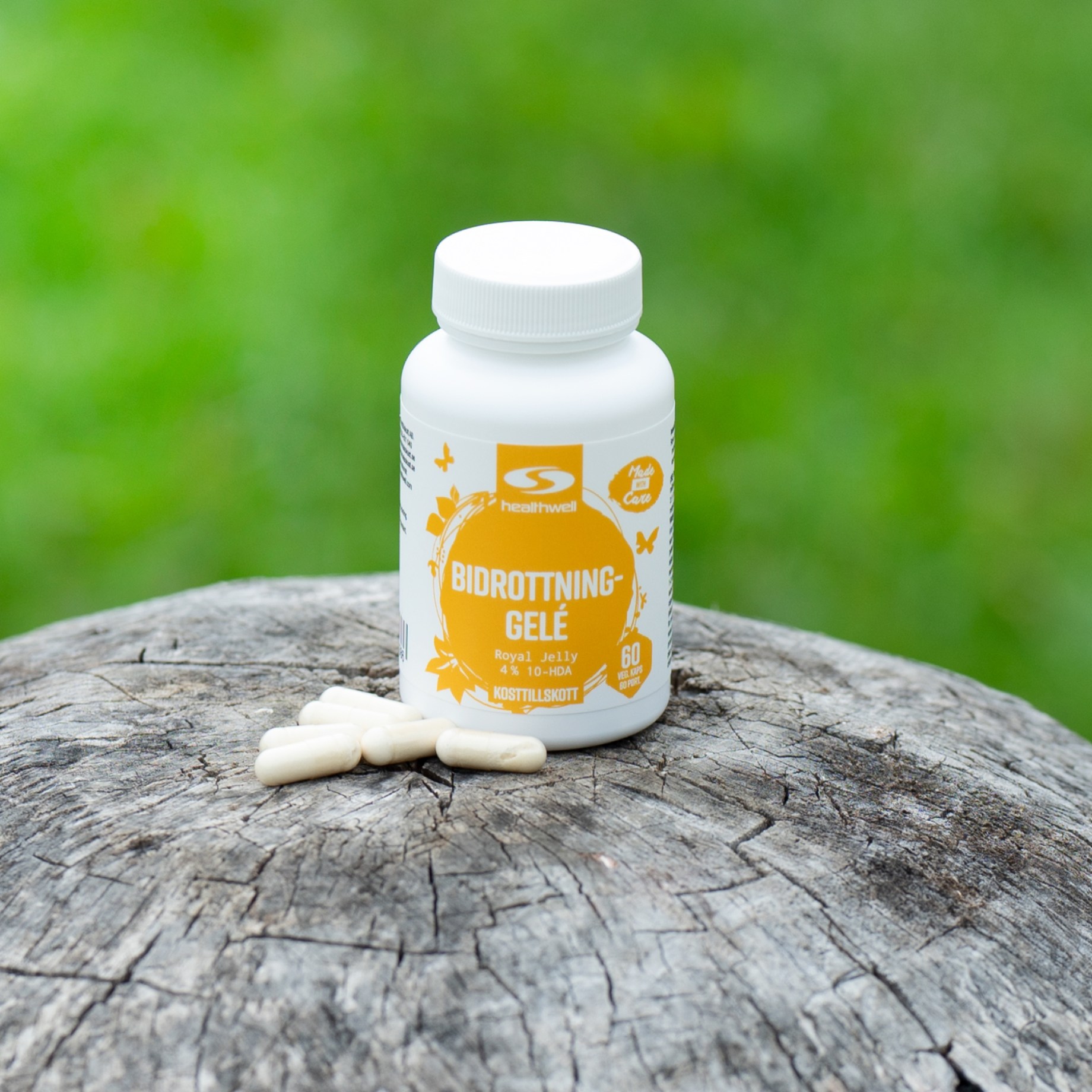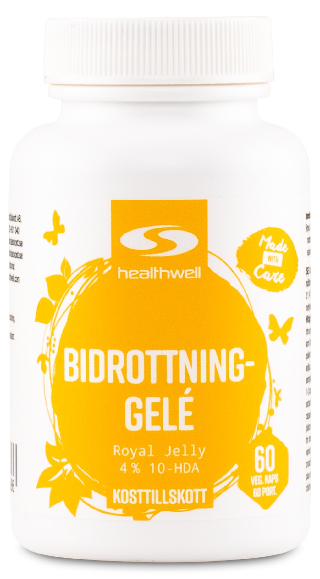Bidrottninggelé innehåller det aktiva ämnet 10-HDA (10-hydroxy-2-decenoic acid), bidrottningsyra. Det är en bioaktiv föreing som finns naturligt i bidrottninggelé och som anses vara en av de främsta aktiva ingredienserna (3). Healthwell Bidrottninggelé innehåller 4 % 10-HDA, vilket indikerar att det kommer från en naturlig och högkvalitativ källa.