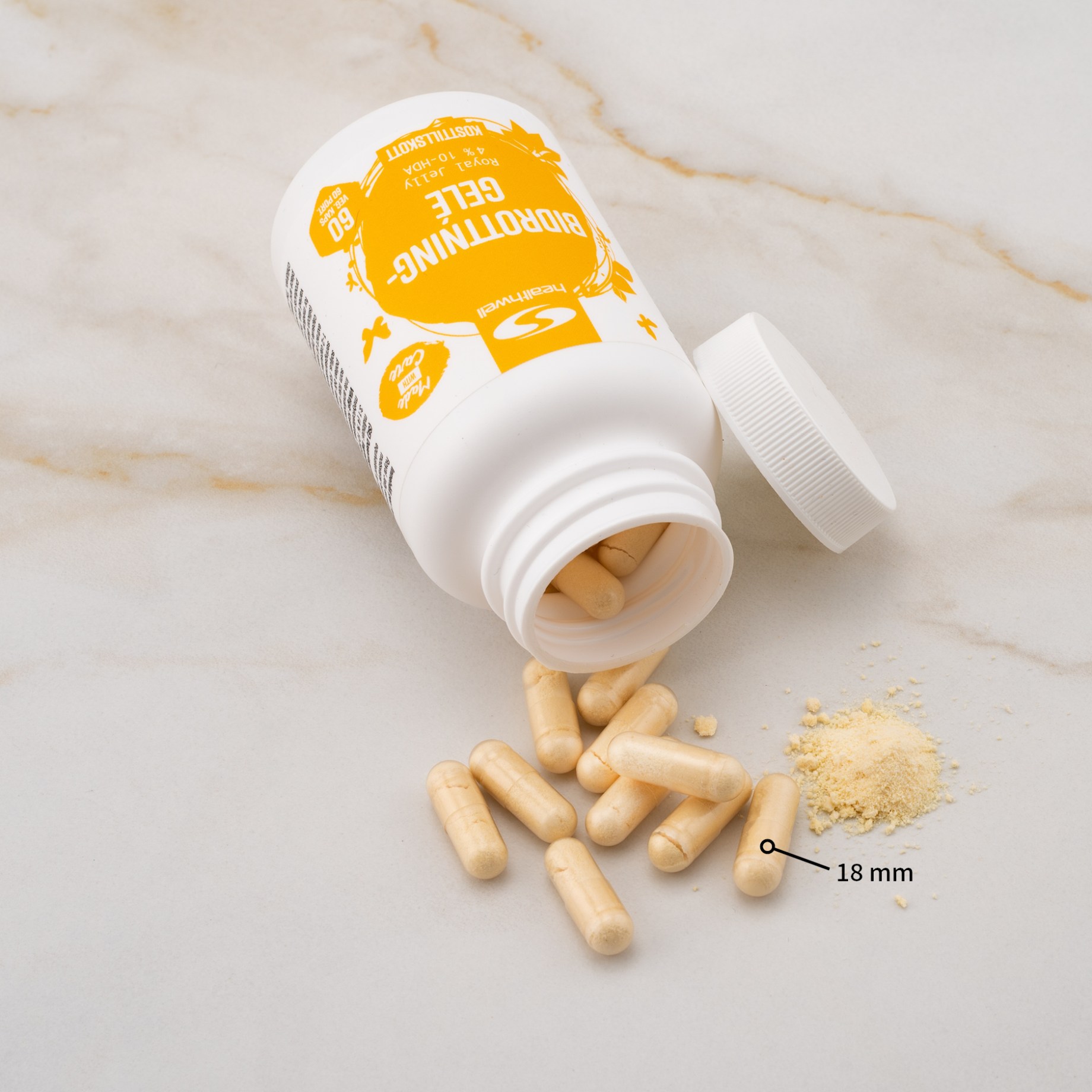 Healthwell Bidrottninggelé (Royal Jelly) innehåller extrakt av bidrottninggele med hela 4 % av den aktiva ämnet 10-DHA. Bidrottninggelé är naturligt rikt på kollagen, mineraler och flera B-vitaminer. Ett intressant ämne som ofta sammankopplas med såväl hudvård som hormonbalans.