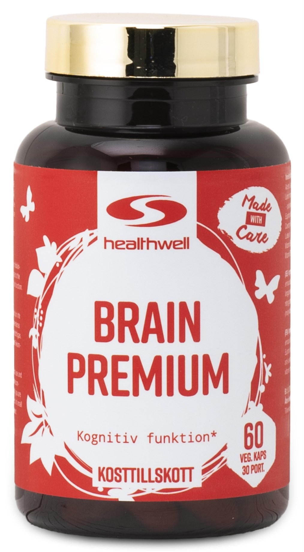 Healthwell Brain Premium innehåller ett komplex speciellt framtaget för att stödja och upprätthålla den mentala funktionen. Det innehåller en effektiv blandning av ämnen; ALC, lion's mane (igelkottstaggsvamp), och Euphoria longana. I komplexet ingår även Q10, som är avgörande för cellernas funktion och kroppens energiomsättning, tillsammans med vitamin B12 och B6 som stödjer hjärnans normala funktion. För ett optimalt komplex ingår även luteolin, ett intressant ämne som uppmärksammas för sin potential.
