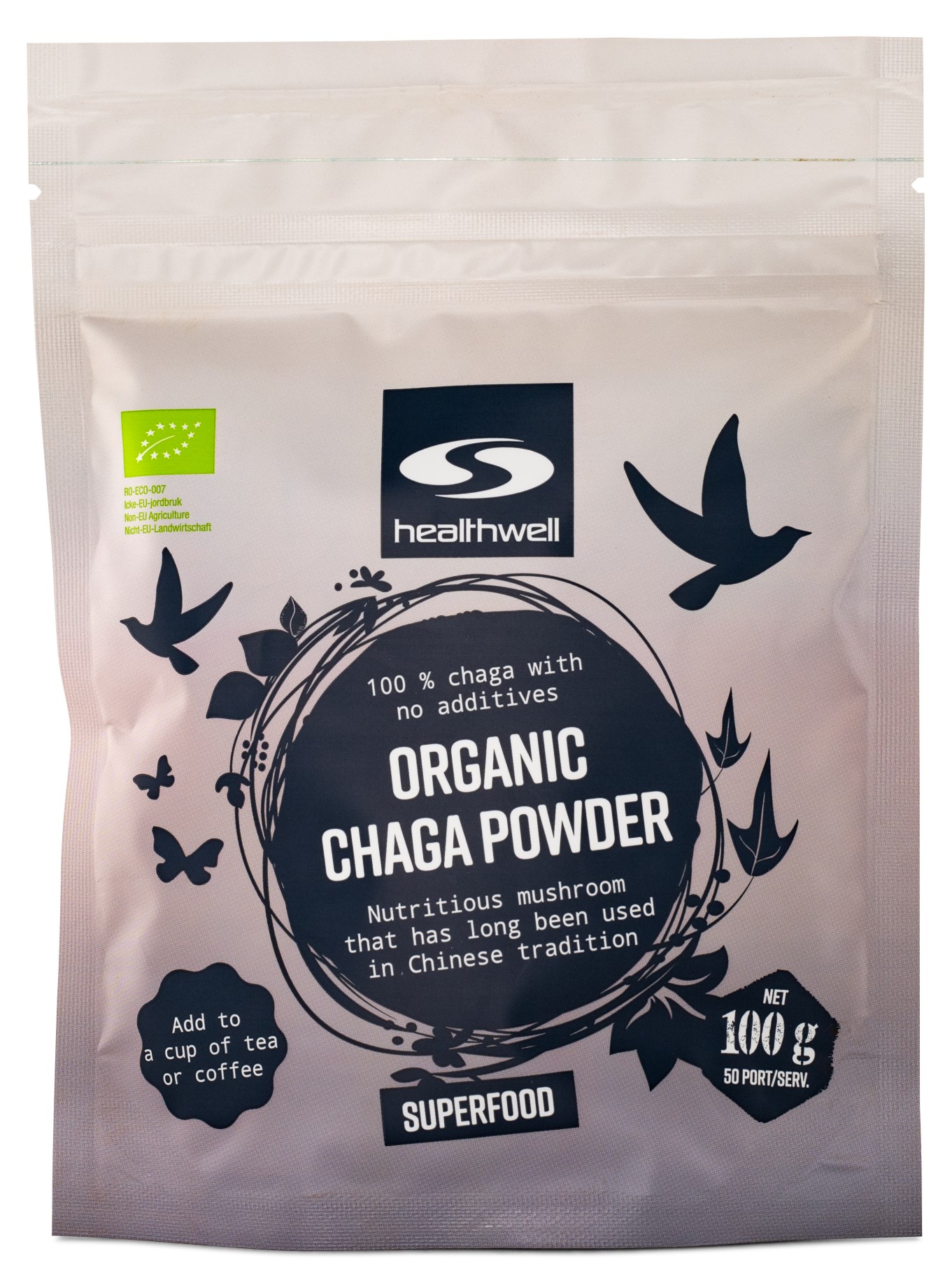 Healthwell Chaga EKO är ett pulver med en mild smak från svampen chaga (Inonotus obliquus), även kallad sprängticka på svenska. Chaga är känd för sitt höga ORAC-värde, vilket innebär att det är rikt på antioxidanter, samt för sitt innehåll av mineraler och vitaminer. Chagapulvret blandas enkelt i varm dryck för att drickas som te.