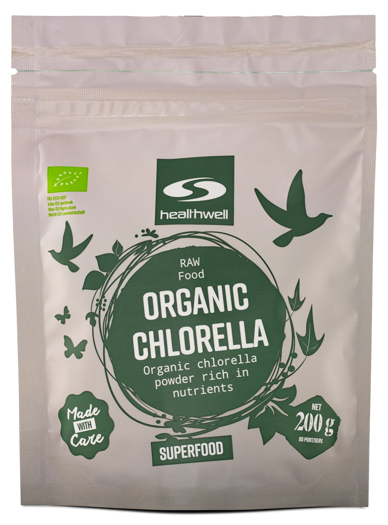 Healthwells Chlorella EKO är ekologisk och odlas varsamt i sötvattensdammar där den skördas, torkas och mals ner till ett näringsrikt pulver. Den skonsamma odlingen bevarar alla viktiga näringsämnen och antioxidanter. Chlorella EKO klassificeras som raw food, vilket innebär att den varsamt behandlas vid tillverkningen för att säkerställa att alla näringsämnen bibehålls, utan att exponeras för temperaturer över 42 grader.