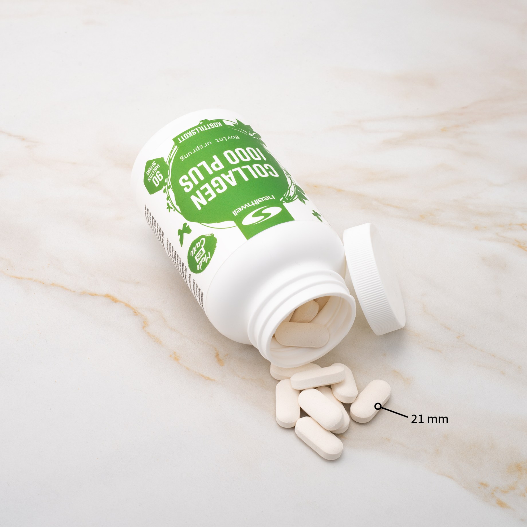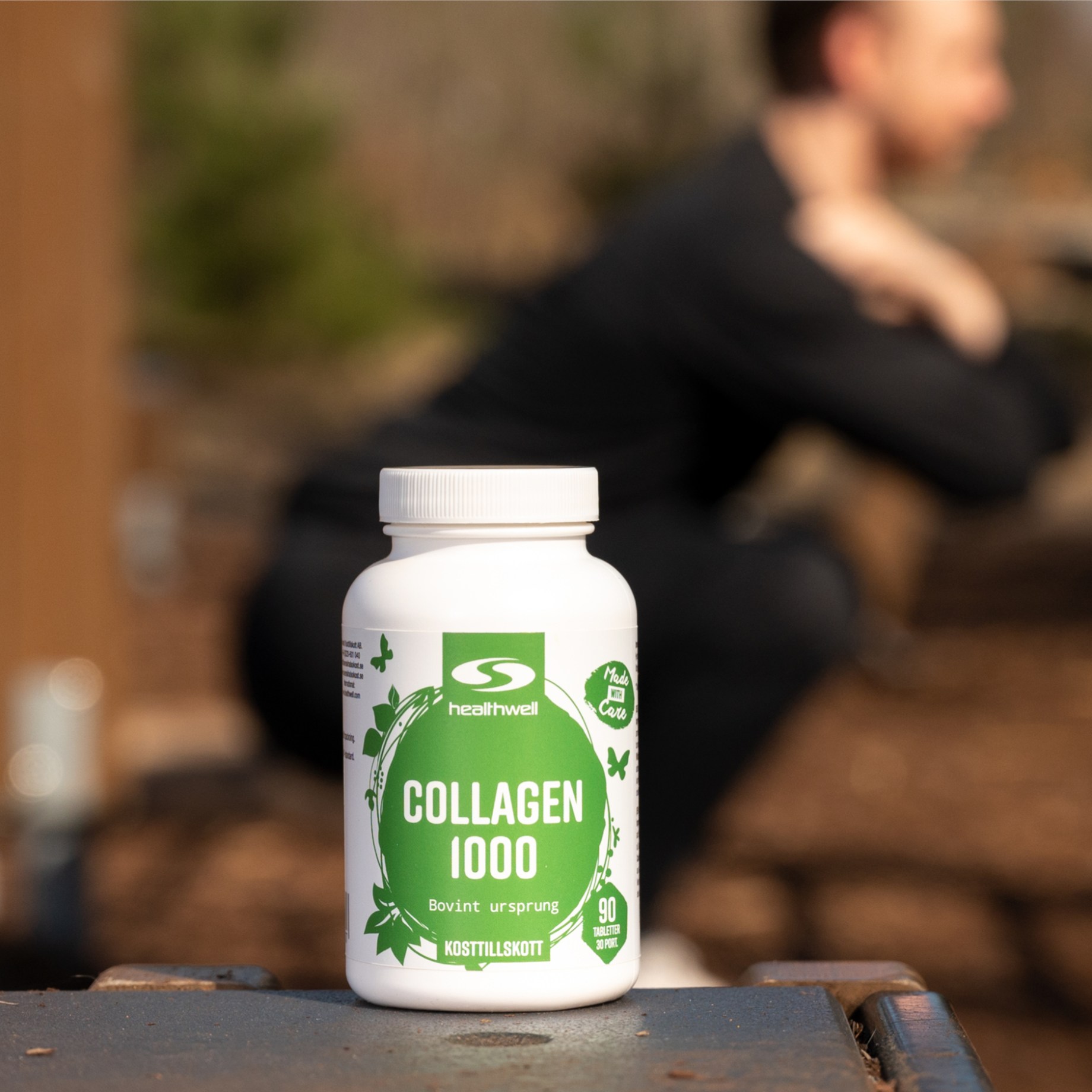 Healthwell Collagen 1000 Plus är ett kosttillskott som innehåller 1000 mg kollagen från nötkreatur per tablett. Det är dessutom berikat med vitamin C, vilket har flera viktiga funktioner i kroppen. Vitamin C fungerar som en antioxidant och skyddar cellerna från nedbrytning orsakad av fria radikaler. Vitaminet bidrar också till att upprätthålla ett normalt immunsystem och har en viktig roll i kroppens produktion av kollagen, vilket gör ämnet extra intressant i kollagentillskott.