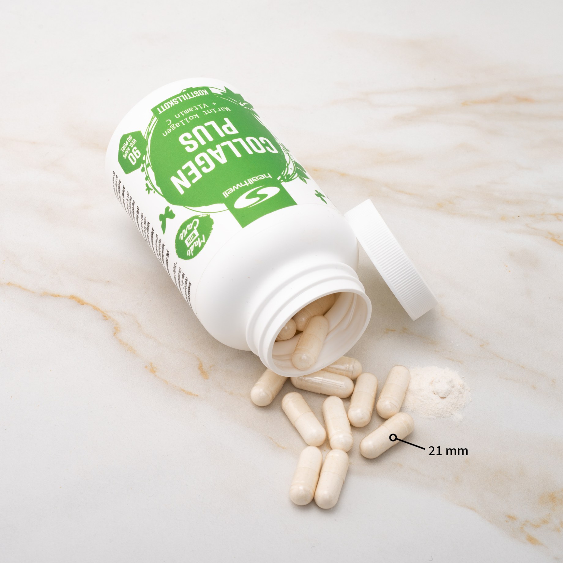 Healthwell Collagen Plus är kapslar som innehåller ECOllagen, ett hydrolyserat kollagen från marint ursprung. Kollagen är ett intressant ämne som vi har naturligt i kroppens bindväv, där det hjälper till att bygga upp strukturen för leder, brosk, hud, hår och naglar. Collagen Plus fungerar som ett smidigt sätt att tillföra extra kollagen, inte minst om du tränar hårt och har en hög belastning på lederna. 1-2 kapslar per dag räcker för ett adekvat intag av kollagen.
