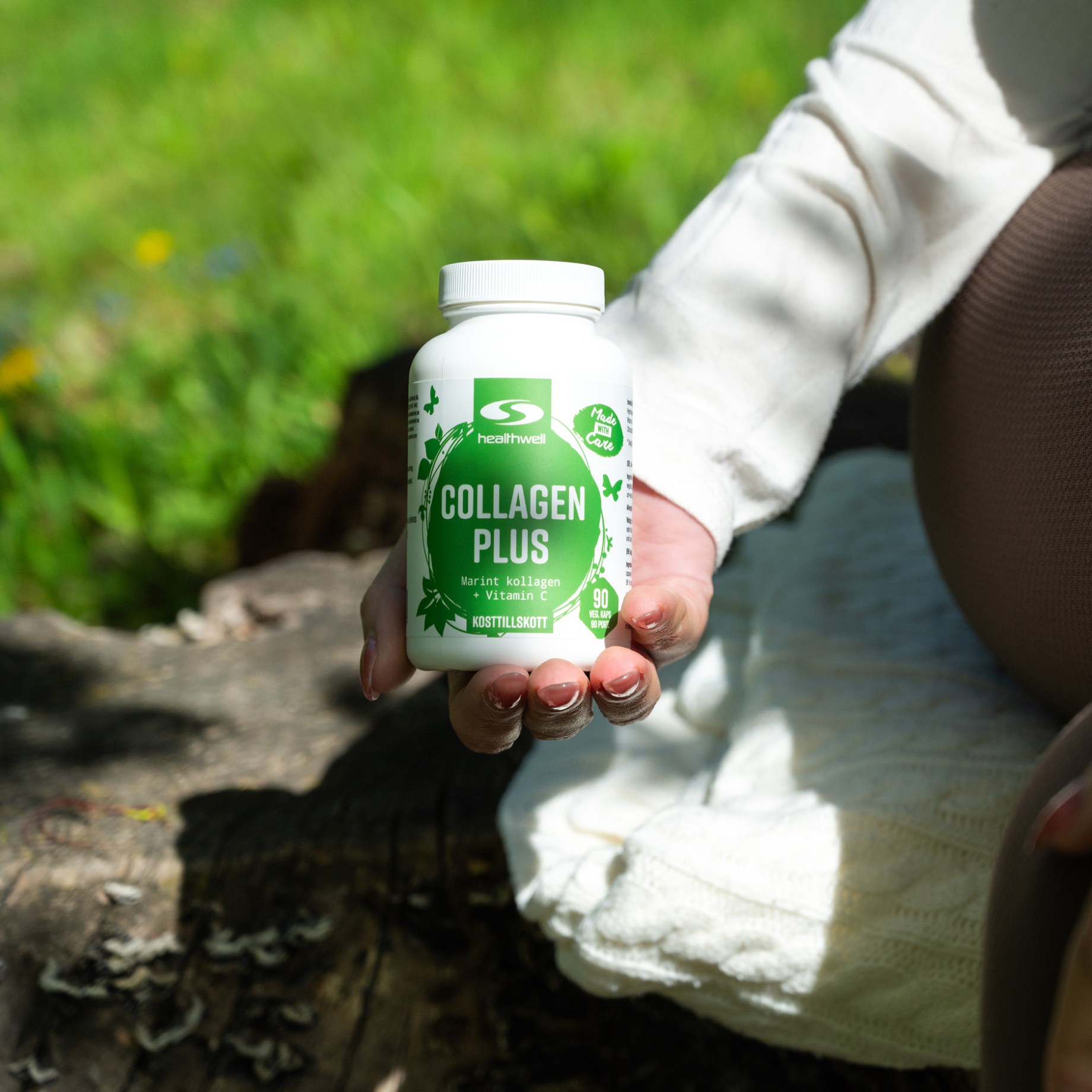 Ett kosttillskott med kollagen är ett enkelt sätt att få i sig mer kollagen än vad du lyckas med via den övriga kosten. Healthwell Collagen Plus innehåller hydrolyserat kollagen från marint ursprung. Fiskkollagen anses av många vara en av de främsta källorna till kollagen, och är dessutom lätt för kroppen att ta upp. Marint kollagen är nämligen rikt på glycin och prolin som är viktiga aminosyror för uppbyggnaden av ledbrosk. Produkten innehåller kollagen med molekylvikt 2000 dalton, vilket är ett mått på att molekylen är tillräckligt liten för att kunna tas upp bra av kroppen. Tack vare att kollagenet i Collagen Plus kommer från marina källor kan det även ätas av personer som utesluter kött ur sin kost. Föredrar du hellre kollagen i pulverform finns Collagen Pulver, även det från marint urpsrung.