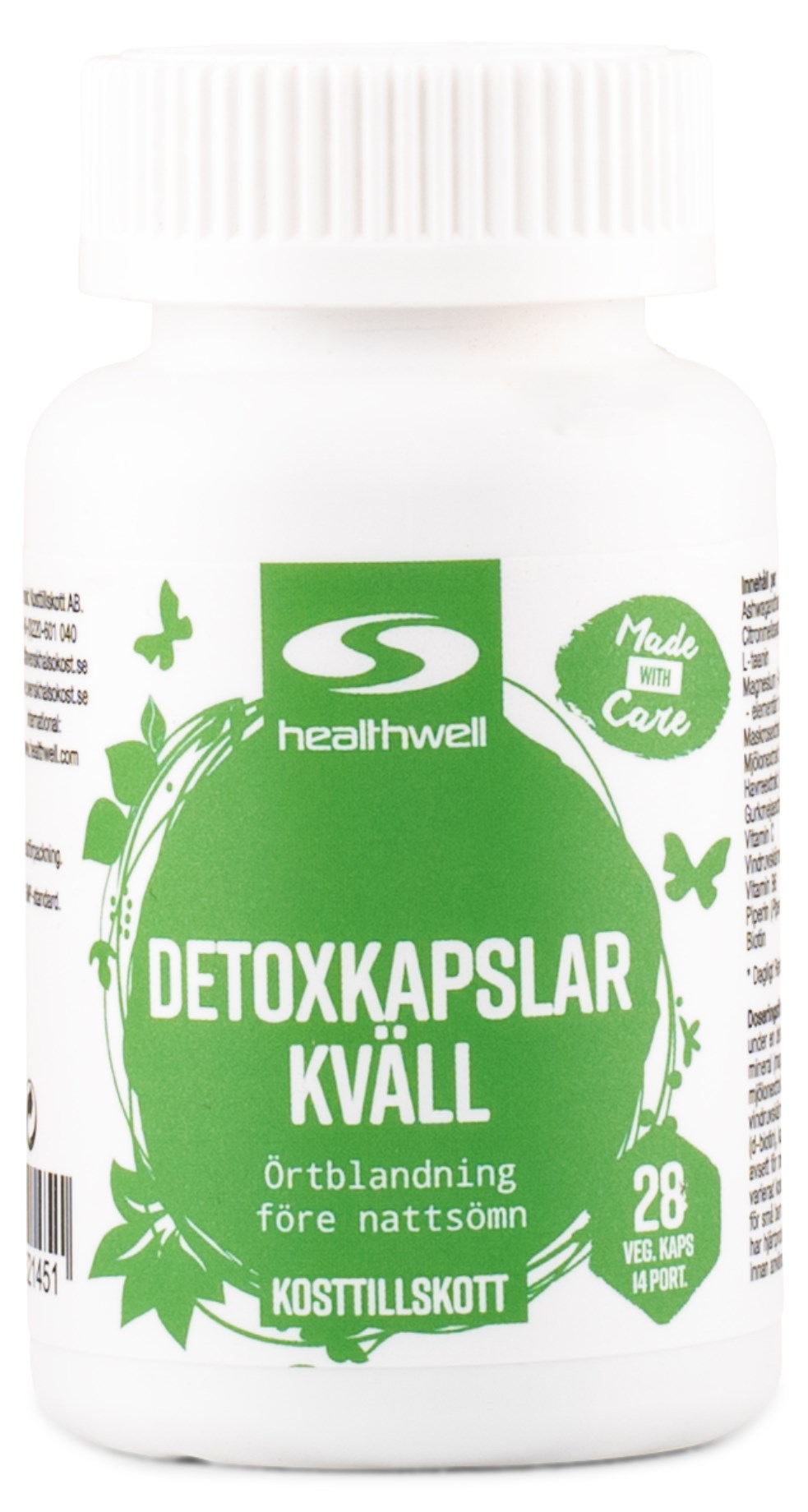 Healthwell Detoxkapslar Kväll har utvecklats med en speciell formula som syftar till att hjälpa kroppen att varva ner och slappna av inför kvällen. Denna unika blandning inkluderar ingredienser som citronmeliss, ashwagandha och L-teanin. Dessutom innehåller den antioxidanten vitamin C, muskelavslappnande magnesium samt biotin och vitamin B6 för att stödja ämnesomsättning och nervsystemets normala funktion. För att säkerställa ett effektivt upptag i kroppen är Detoxkapslar Kväll förstärkta med piperin, ett extrakt av svartpeppar. Med dessa kapslar kan du främja en avkopplande och återhämtande nattsömn.