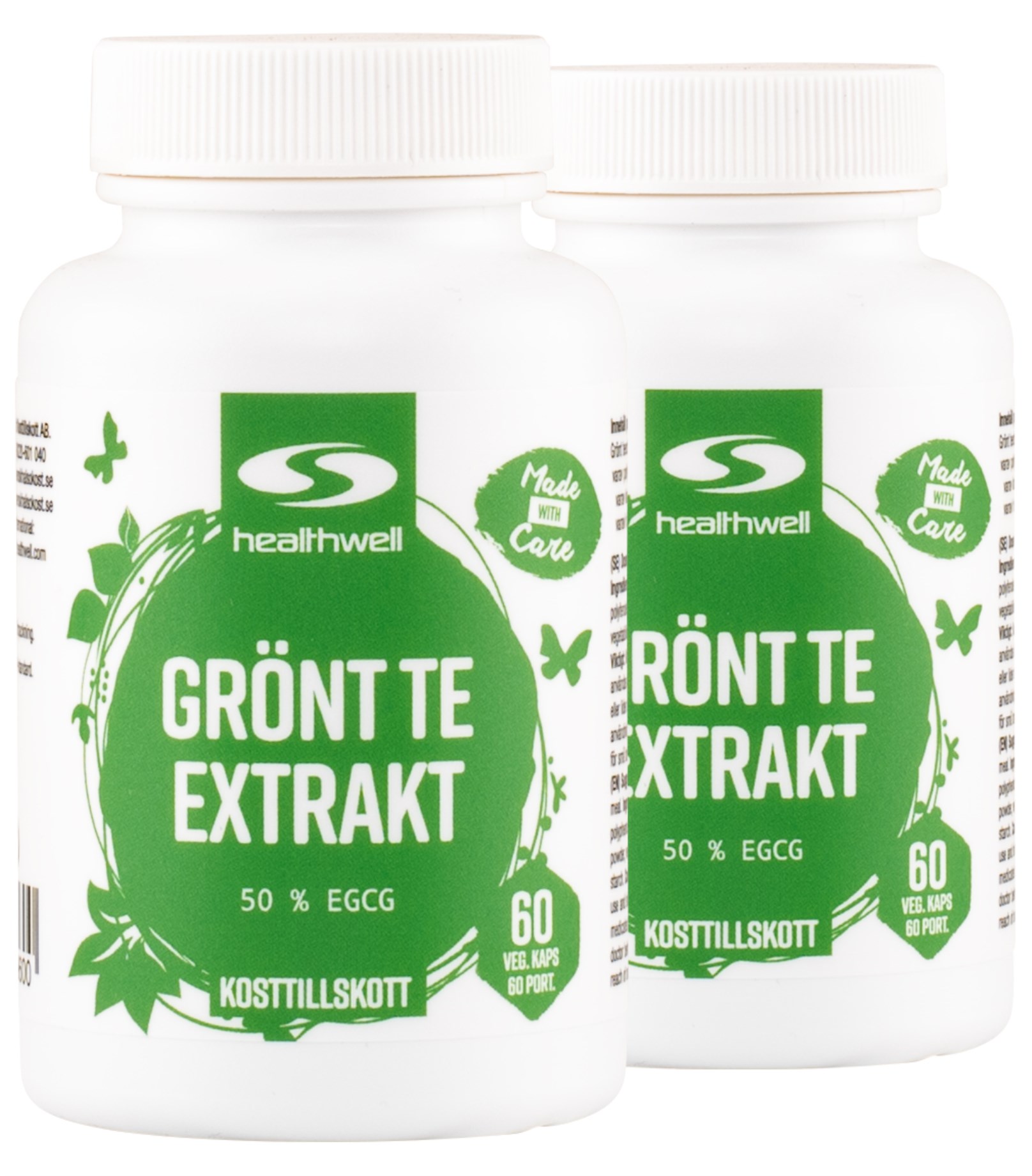 Upptäck fördelarna med grönt te med Healthwell Grönt Te Extrakt! Extraktet, i vegetabiliska kapslar, kommer från noggrant utvalda tebuskar (Camellia sinensis) och är standardiserat till hela 95 % polyfenoler, varav 50 % EGCG, den mest aktiva komponenten i grönt te. För att bevara så mycket som möjligt av teets näringsämnen torkas det varsamt. Eftersom produkten innehåller koncentrerat grönt te-extrakt, behöver du inte konsumera stora mängder för att få nytta av dess hälsofördelar. Faktum är att 1 kg Healthwells gröna te-extrakt motsvarar 15 kg vanligt grönt te.