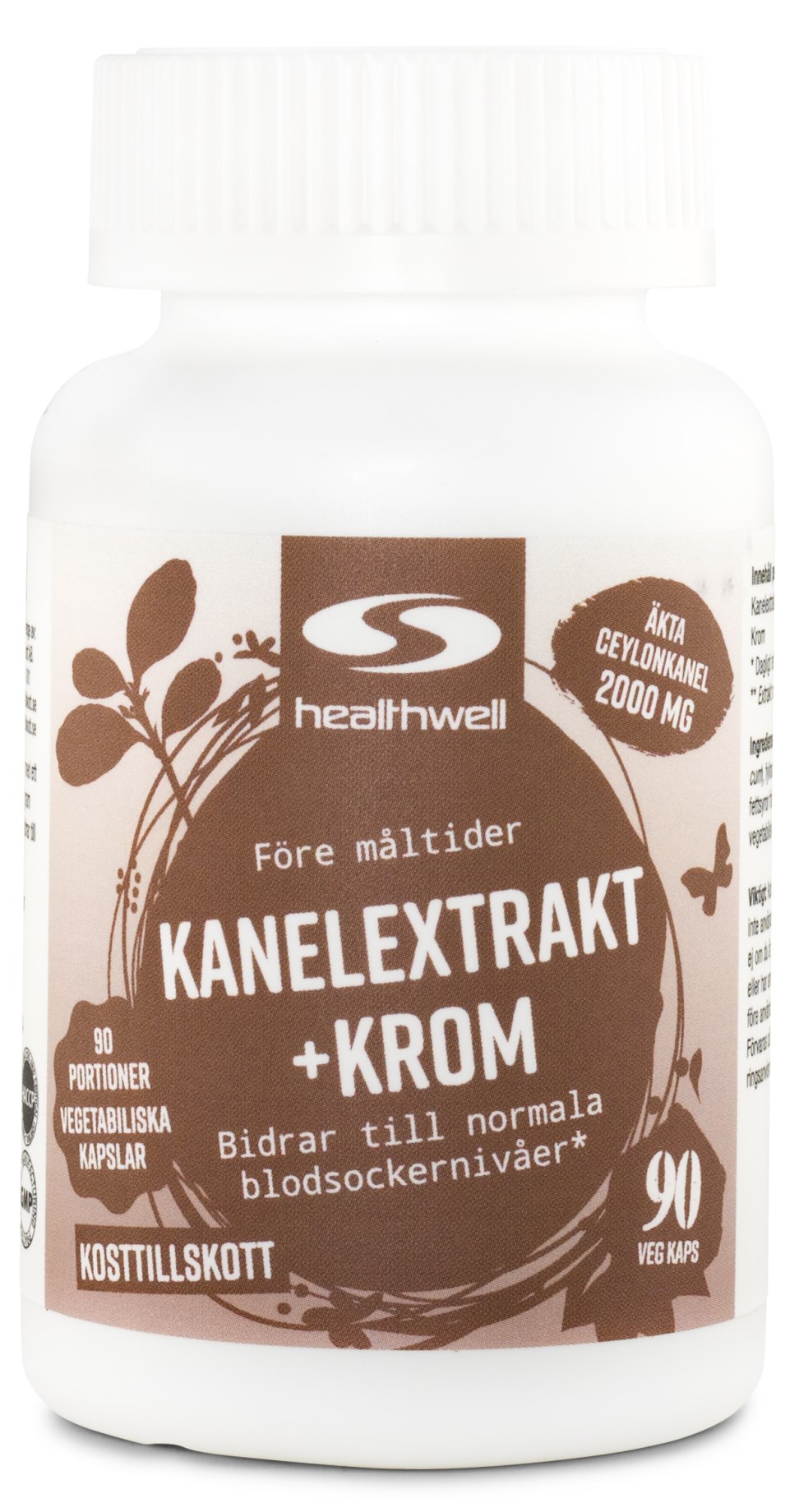 Healthwell Kanelextrakt + Krom är vegetabiliska kapslar med ett högvärdigt extrakt från kanel (Cinnamomum zeylanicum), tillsammans med mineralet krom för en optimal verkan. Krom bidrar till att bibehålla normala blodsockernivåer. Rekommenderad dosering är 1 kapsel 2 gånger om dagen, före måltider.