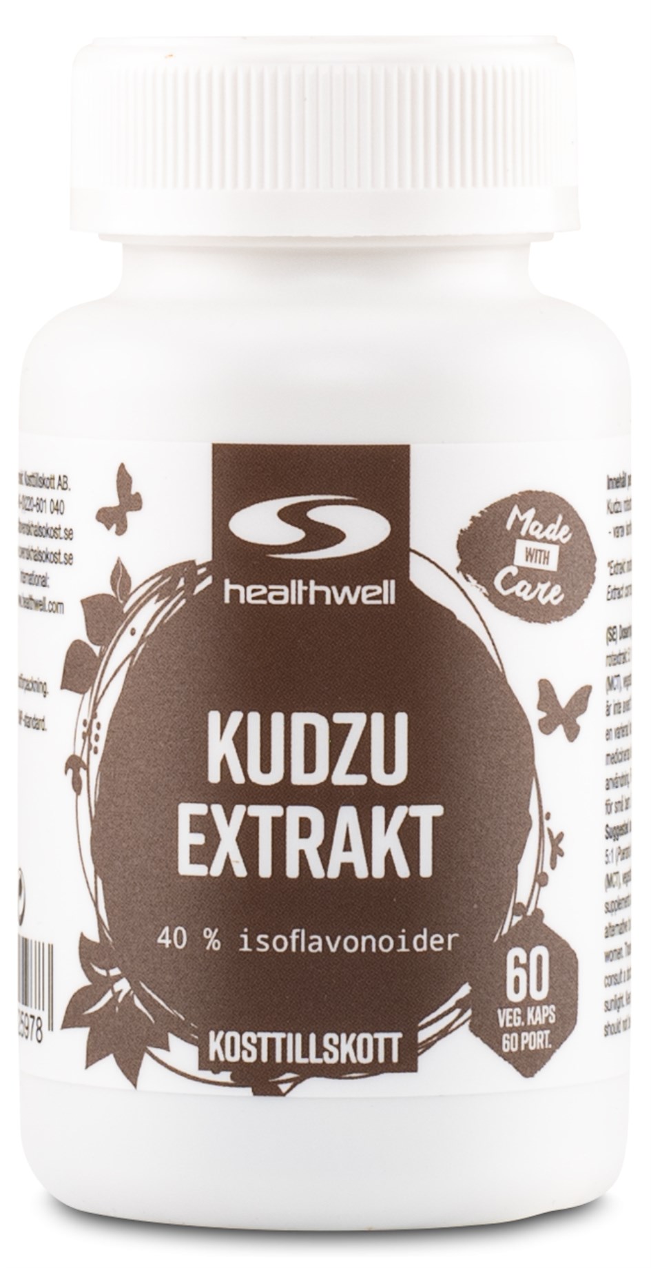 Healthwell Kudzu Extrakt innehåller extrakt från kudzurot (Pueraria lobata), där varje kapsel rymmer 500 mg kudzuextrakt, motsvarande 2,5 gram torkad rot, med minst 40 % isoflavonoider. Kudzu har en lång tradition inom kinesisk medicin för sina hälsofrämjande egenskaper. Rekommenderad dos är 1 kapsel 1-2 gånger dagligen.