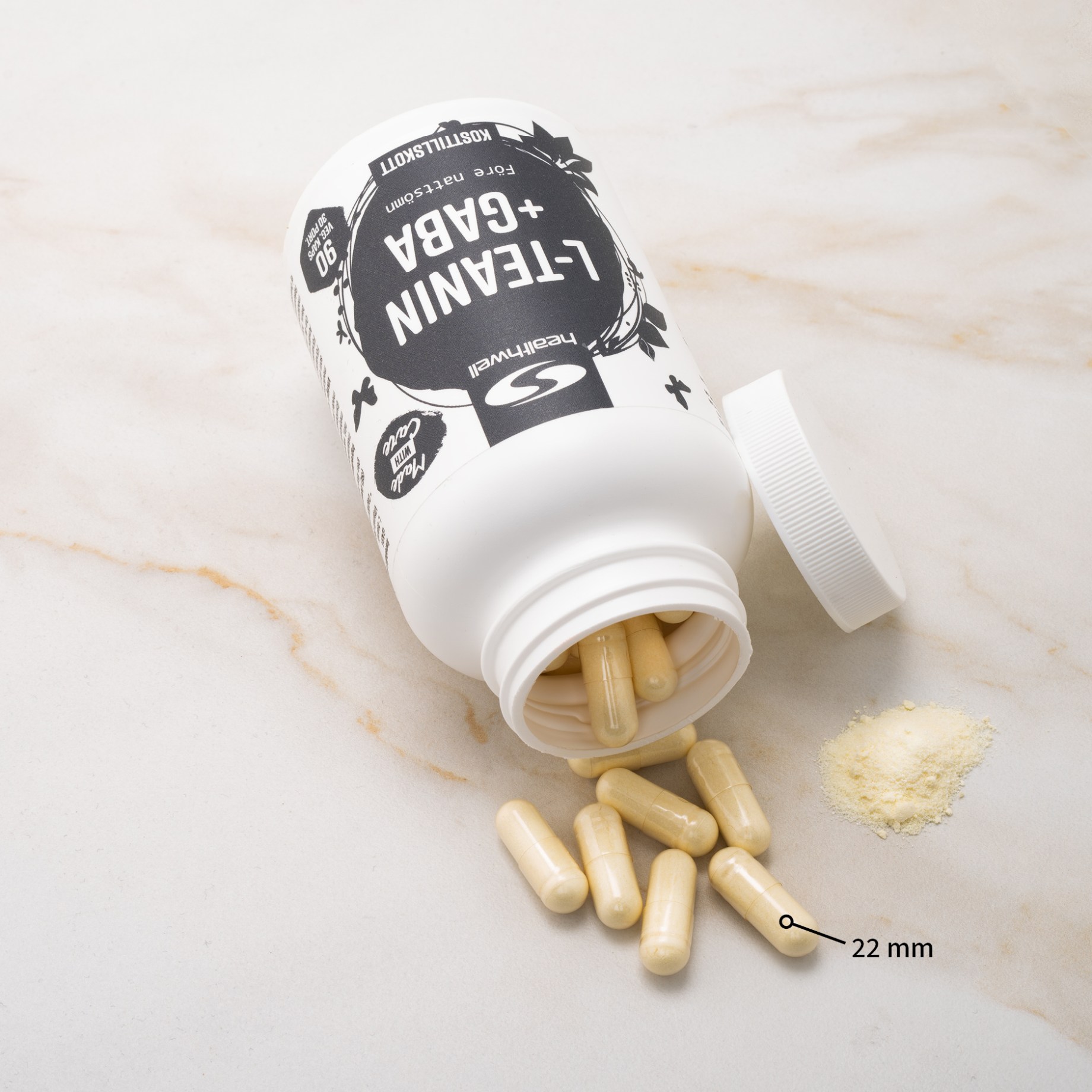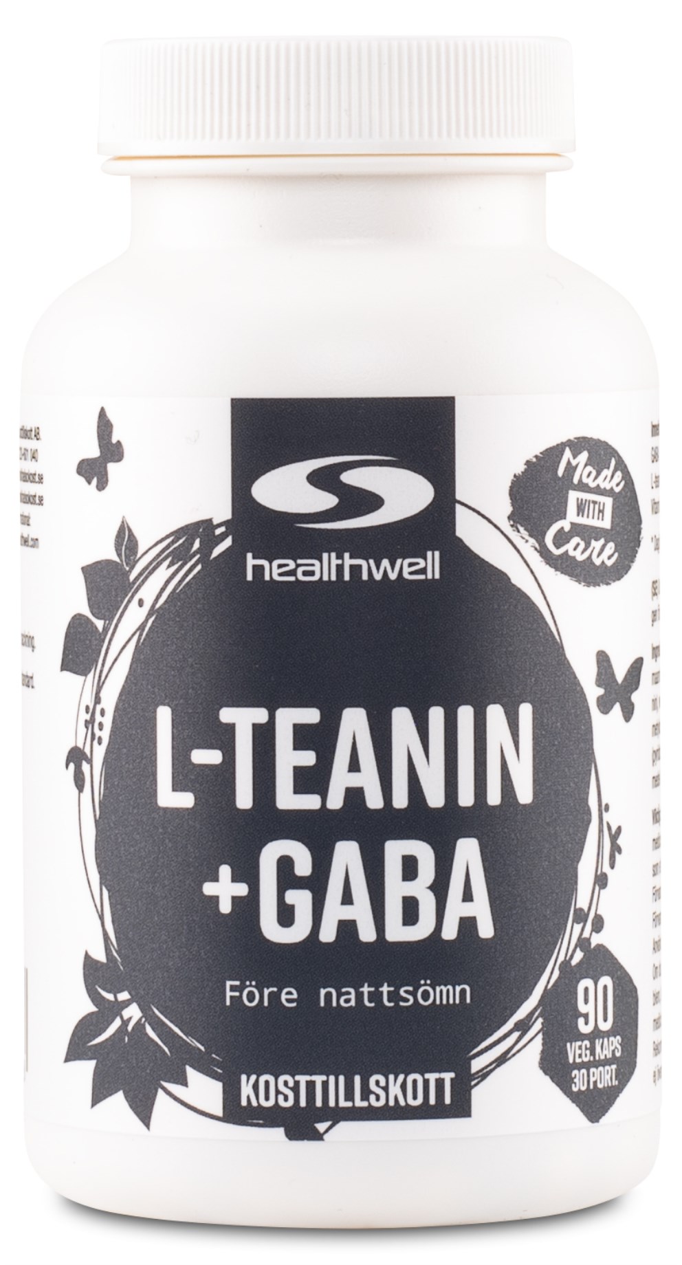Healthwell L-teanin och GABA är ett kosttillskott med de intressanta ämnena L-teanin och GABA i smidiga vegetabiliska kapslar. L-teanin är en aminosyra som finns naturligt i grönt te, och GABA (gammaaminosmörsyra) fungerar som en hämmande signalsubstans i kroppens nervsystem. Ämnena kompletterar varandra på ett bra sätt och kan enligt forskning vara extra fördelaktiga när de tas tillsammans. Healthwell L-teanin + GABA innehåller även vitamin B6 som bidrar till nervsystemets funktion. En portion (3 kapslar) ger hela 1600 mg GABA samt 400 mg L-teanin, och tas innan sänggående.
