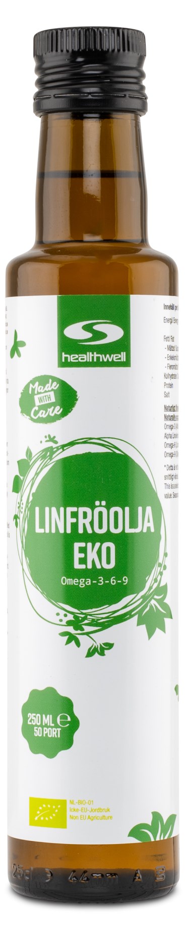 Healthwell Linfröolja EKO är en ekologiskt certifierad linfröolja. Den kallpressade oljan kommer från linfrön som varsamt pressats utan värme eller tillsatta kemikalier, vilket bevarar dess näringsämnen bättre. Linfröolja gör sig lika bra som ett dagligt tillskott av nyttiga fettsyror som till ett hälsosammare supplement till salladen. Linfröolja är naturligt rik på omega-3 som annars återfinns främst i fet fisk. Healthwell Linfröolja EKO är helt vegetabilisk och passar dig som äter vegetariskt eller plantbaserat och vill ha ett enkelt sätt att tillföra de viktiga fettsyrorna. Läs mer om linfröolja.