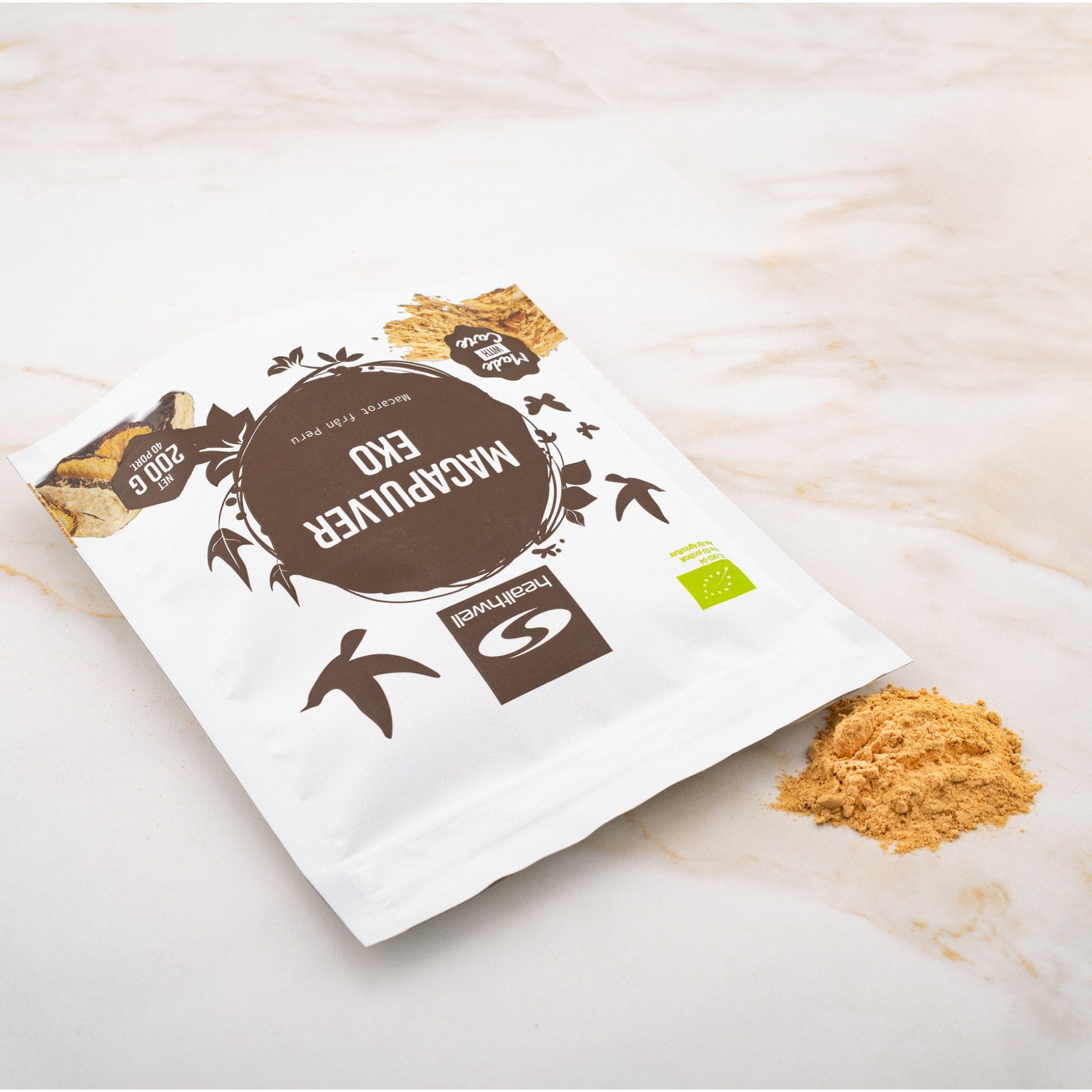 Healthwell Macapulver EKO är ett rent och ekologiskt macapulver extraherat från ren macarot. Macaroten härstammar från Peru, som ofta kallas “macarotens modersland”. Maca brukar är en flitigt använd ingrediens i energirika smoothies – men pulvret kan också enkelt blandas i valfri vätska, som vatten eller mjölk. Macarotens smak likställs ofta med pepparrot och palsternacka. Healthwell Macapulver EKO är ekologiskt och helt veganskt. Perfekt för dig som vill ha en naturlig, energigivande dryck i vardagen!