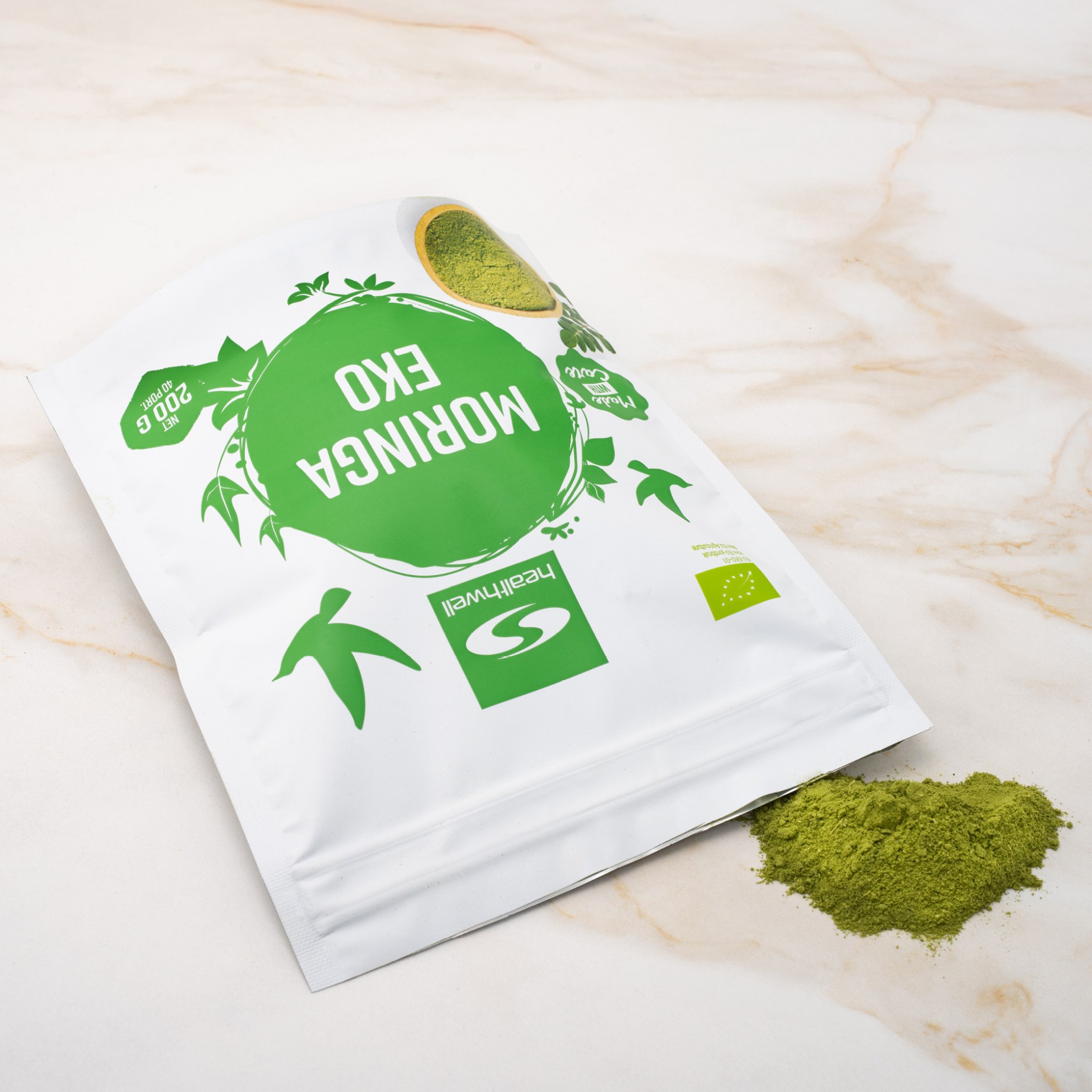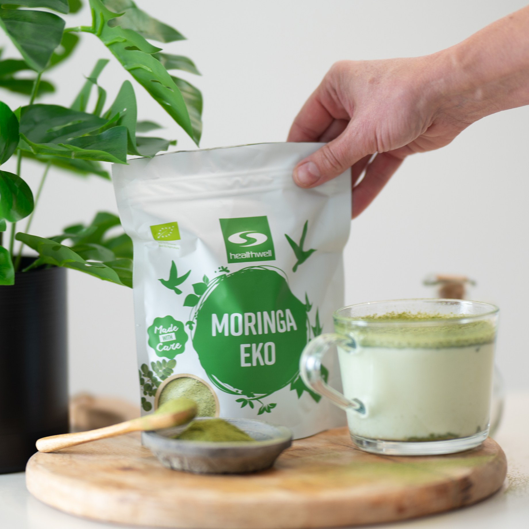 Healthwell Moringa EKO är ett pulver gjort av den näringsrika moringaväxten (Moringa oleifera), även känd som “mirakelträdet” tack vare sitt rika näringsinnehåll. Moringa är fylld med aminosyror, antioxidanter och flera viktiga mineraler och vitaminer. Detta finmalda pulver är enkelt att blanda i vatten, te eller en hälsosmoothie. Moringa har en ljus till mellanmörk grön färg och en unik, lätt kryddig smak som påminner om pepparrot.