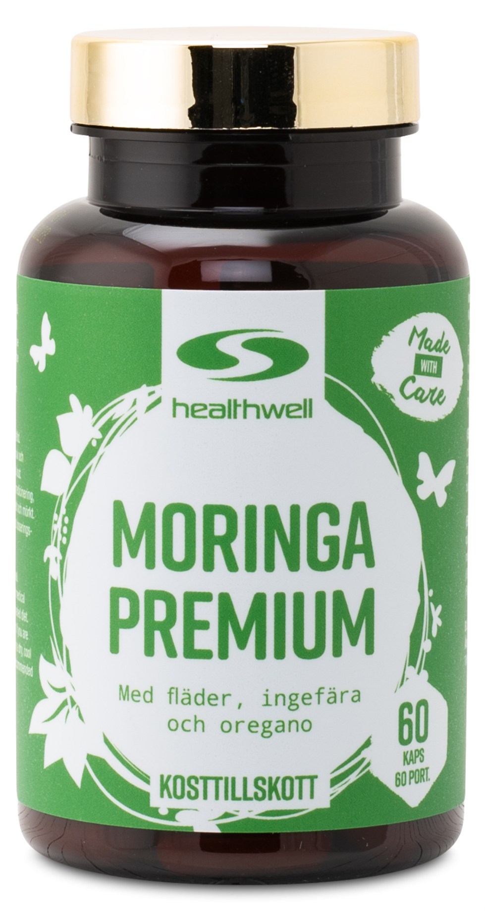 Healthwell Moringa Premium är ett koncentrerat tillskott med moringaextrakt av den allra bästa kvaliteten. Genom en enda kapsel får du i dig hela 5 gram moringapulver, vilket är en riktigt bra portion av den näringsrika växten. Dessutom är moringaextraktet standardiserat till 5 % quercetin – ett ämne som kan främja kroppens upptag av zink, som i sin tur stödjer bland annat immunfunktionen. Healthwell Moringa Premium är dessutom förstärkt med populära örter med en lång tradition av användning, som studeras för sina potentiella roller inom immunförsvar, matsmältning och inflammation. För bästa upptag ingår även piperin från svartpepparextrakt, som ökar biotillgängligheten av ämnena.