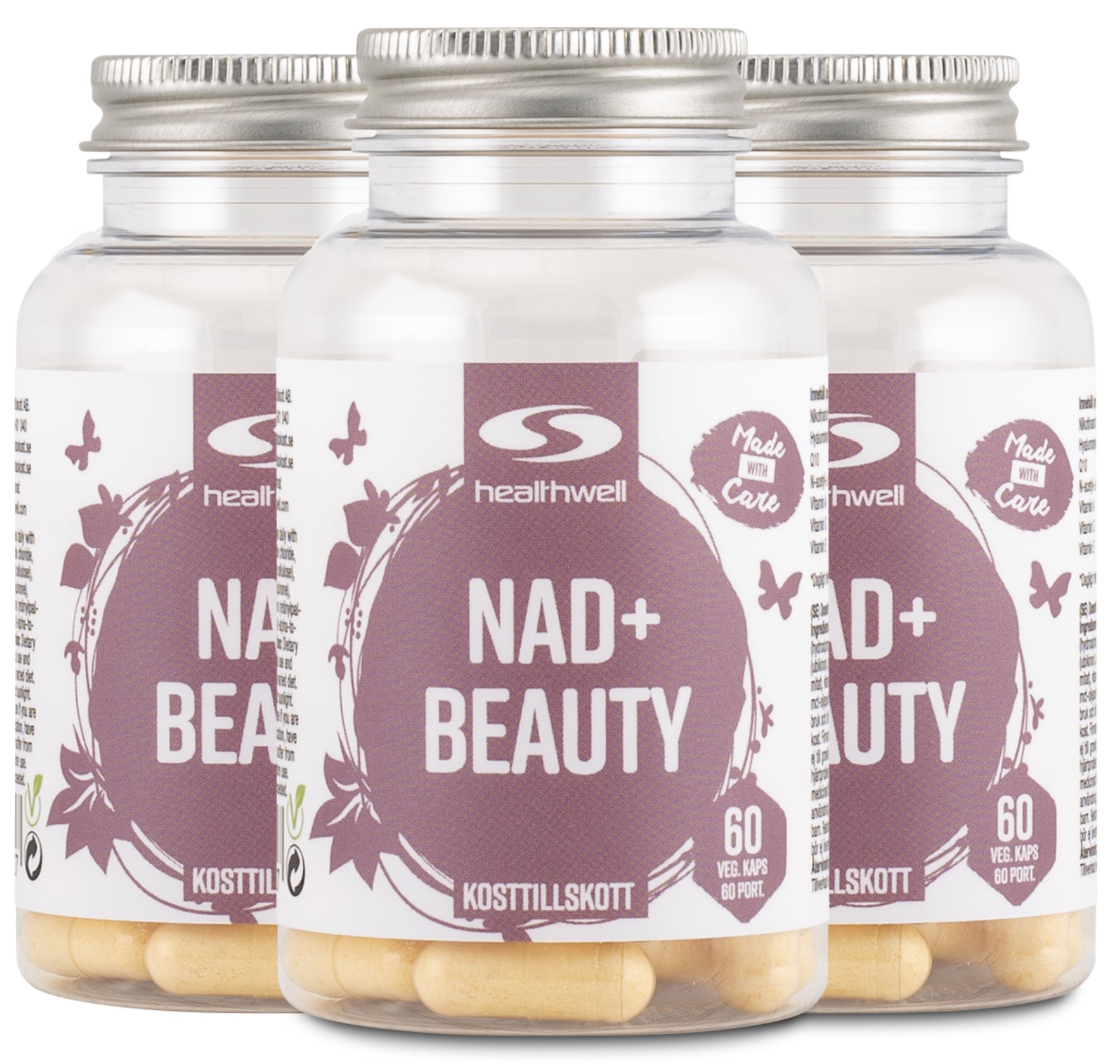Boosta din skönhet inifrån med NAD+ Beauty från Healthwell! Kosttillskottet innehåller nikotinamid ribosidklorid som arbetar för att främja normala nivåer av NAD+ i kroppen. Utöver detta innehåller kosttillskottet N-acetylcystein (NAC), Q10, hyaluronsyra och utvalda antioxidanter för att ge huden en extra skönhetsboost. NAD+ Beauty från Healthwell är ett självklart val för dig som vill främja din skönhet inifrån.