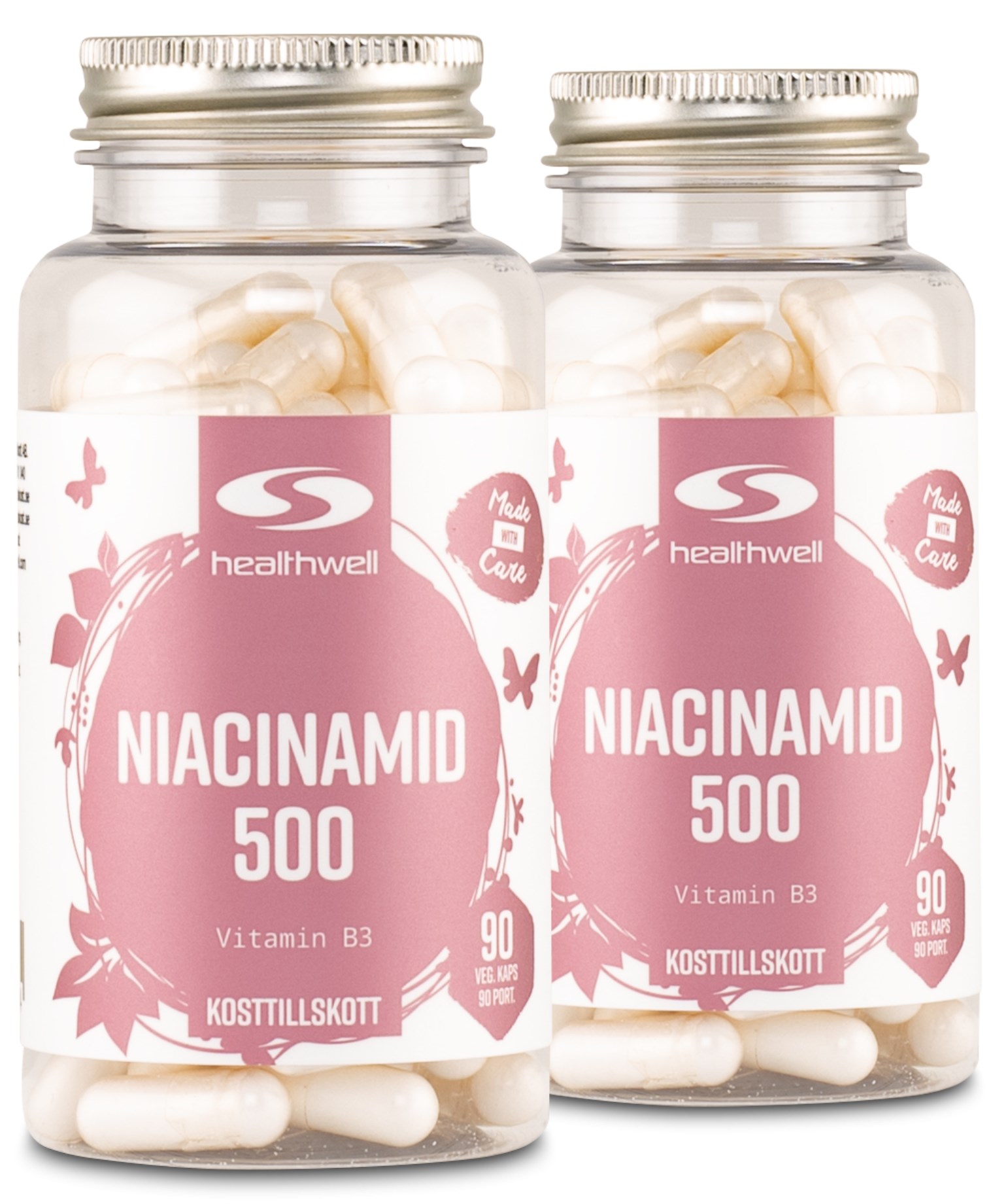 Ge extra omsorg åt ditt hår, din hud och dina naglar med Healthwell Niacinamid 500, kapslar fyllda med niacinamid, en form av vitamin B3. Niacinamid är en vanlig ingrediens i skönhetsprodukter, både för inre och yttre användning, och är känt för sina många positiva effekter, inklusive att bidra till normal hud.