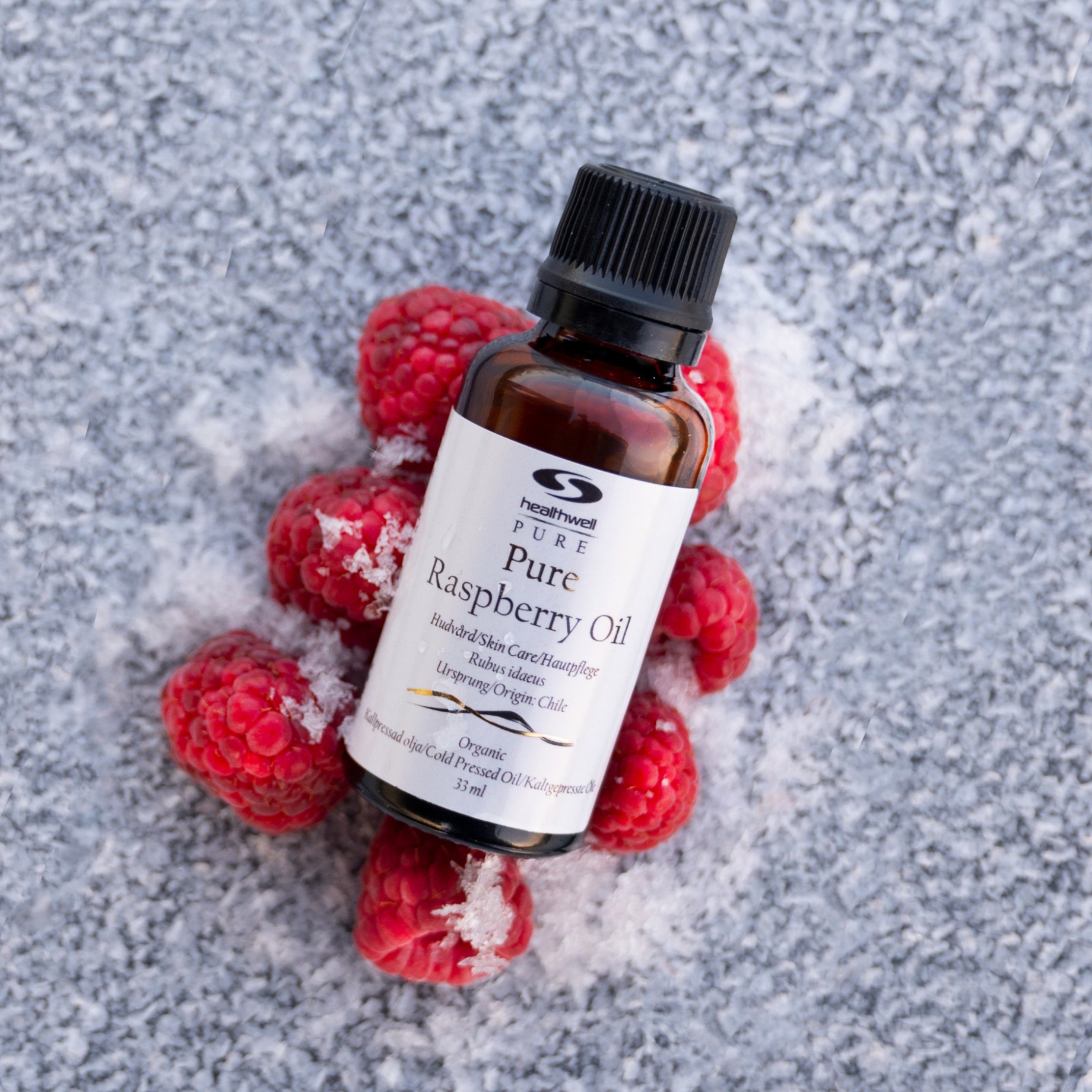 En flaska Healthwell PURE Hallonfröolja EKO dekorerat med färska hallon.PURE Hallonfröolja är perfekt till hud- och hårvård.