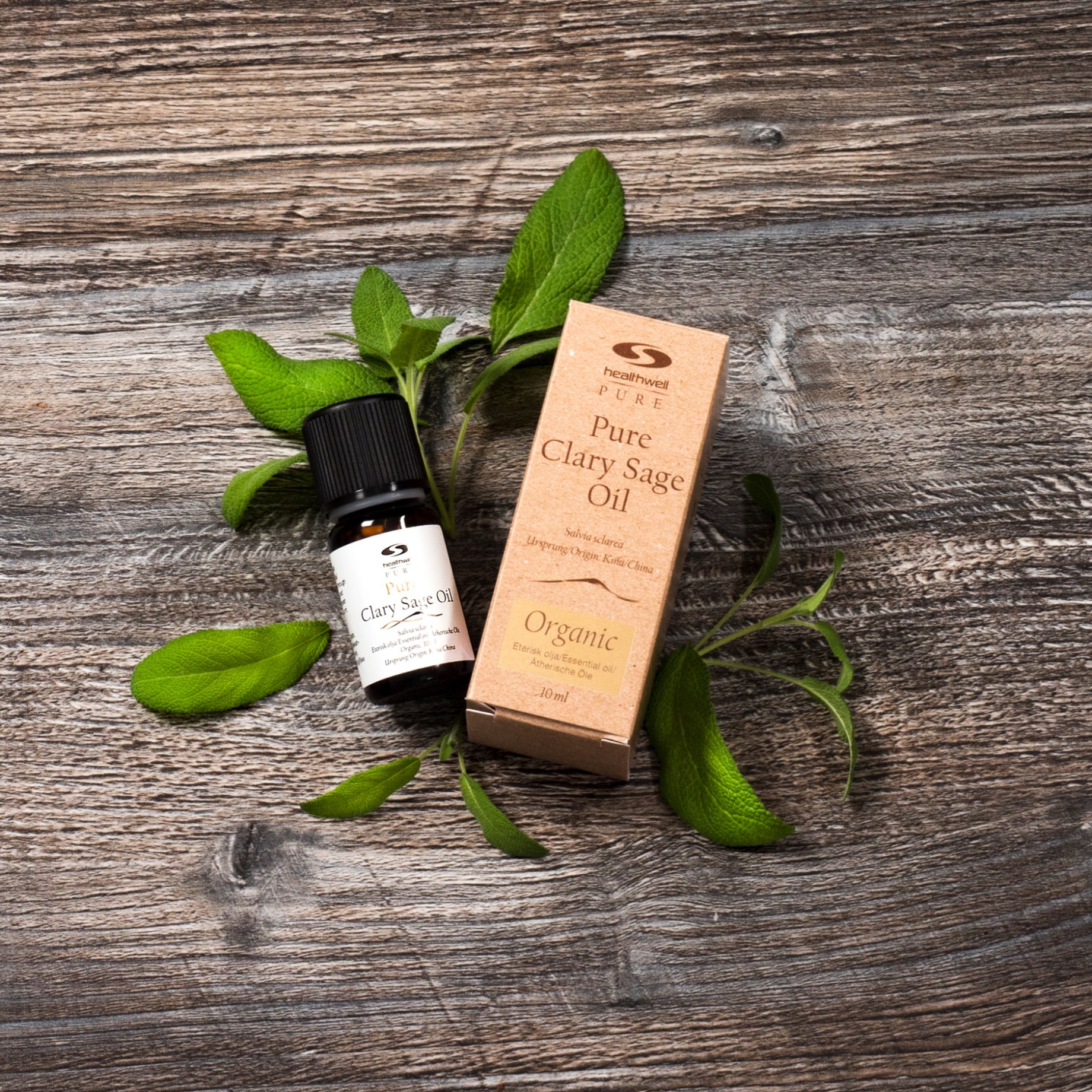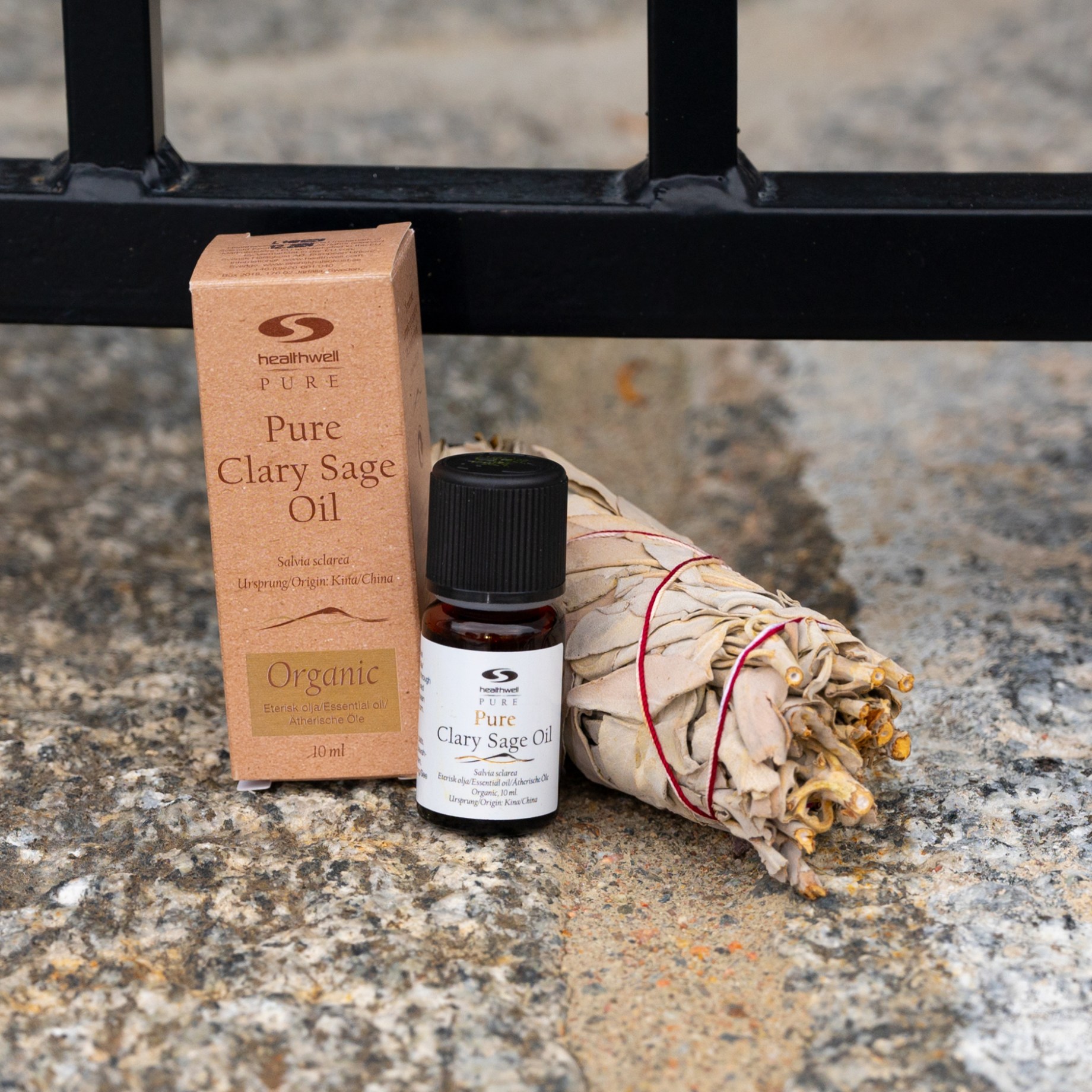 Healthwell PURE Salviaolja EKO flaska och kartong placerad bredvid en rökelsebunte av salvia. PURE Salviaolja EKO har en frisk och örtig doft.