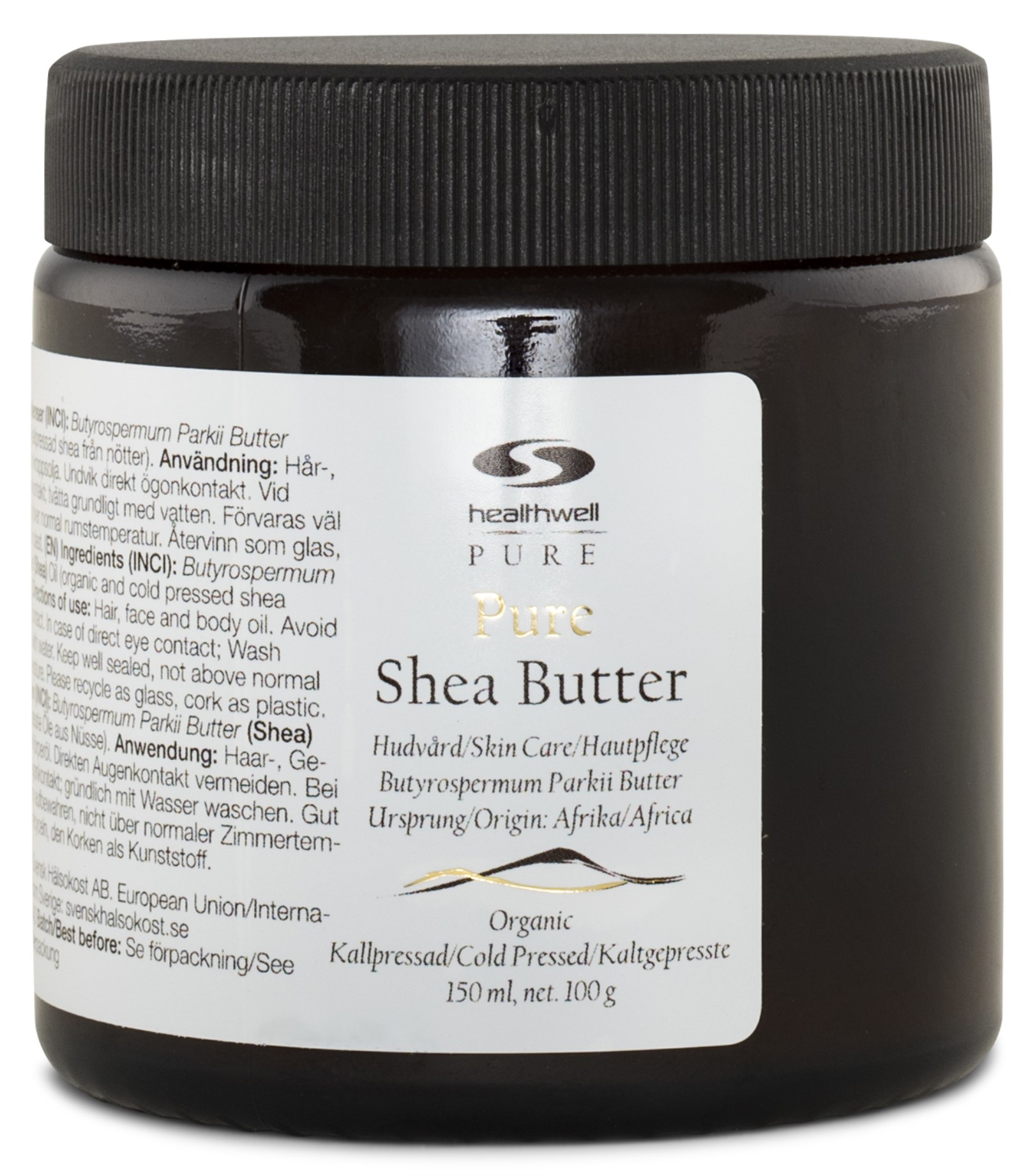 Healthwell PURE Sheasmör EKO är ett 100 % naturligt sheasmör (Butyrospermum Parkii Butter) helt utan tillsatser. Det är ekologiskt och kallpressat från sheanötter som växer i Afrika, odlade under ekologiska former och kallpressas för att bevara alla näringsämnen och egenskaper på bästa sätt. Produkten är helt ren och naturlig, utan tillsatser. Sheasmöret är utmärkt för att vårda torr hud i både ansiktet och på kroppen, samt som hårolja.