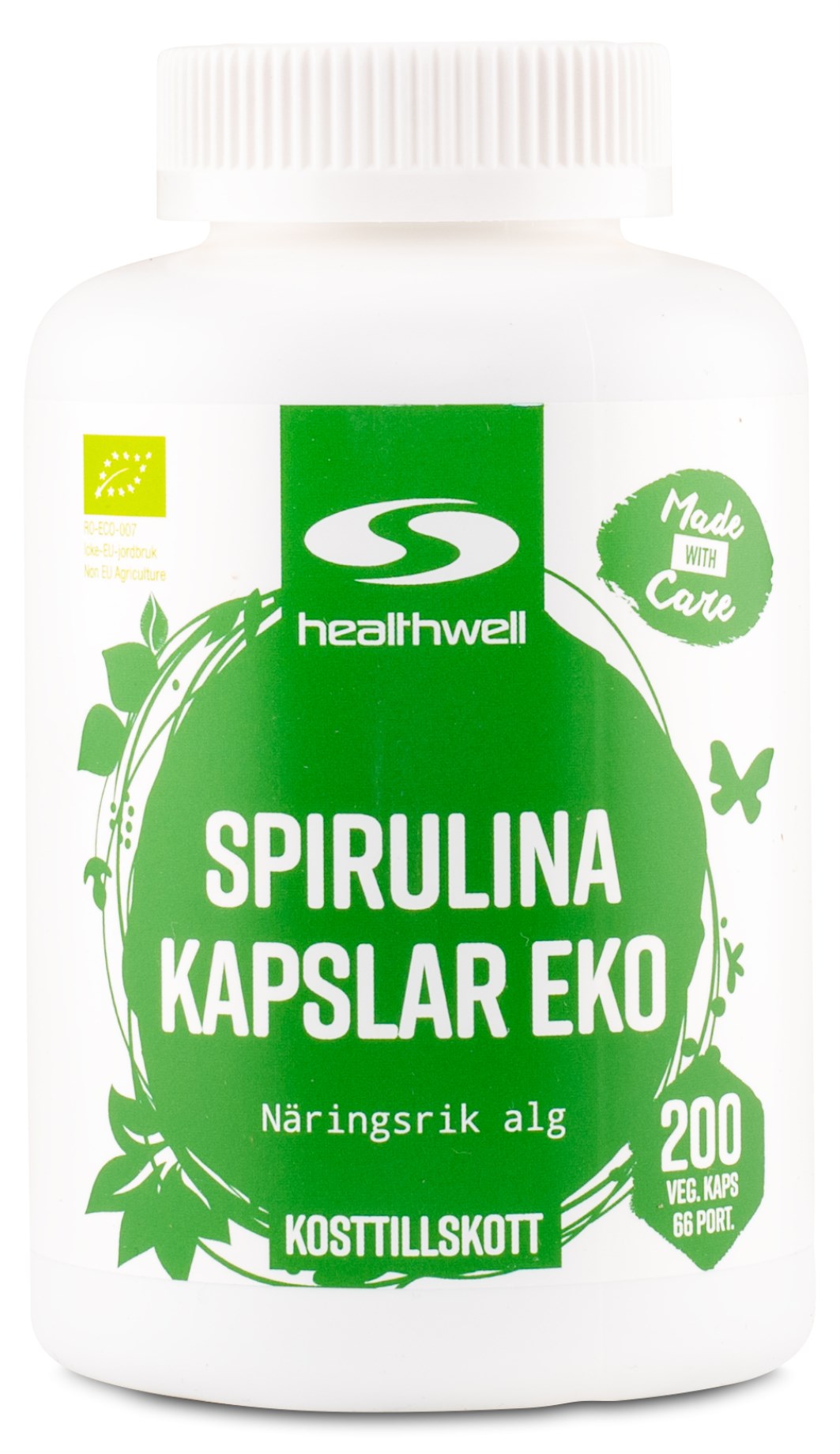 Healthwell Spirulina Kapslar EKO är ett ekologiskt tillskott som innehåller den näringsrika blågröna algen spirulina, känd för sitt höga klorofyllinnehåll. Klorofyll ger växten dess gröna färg och är mycket näringsrikt. Spirulina består av över 60% protein och innehåller alla essentiella aminosyror. Den är även rik på flera viktiga vitaminer och mineraler, inklusive järn som minskar trötthet, samt vitamin C och E som fungerar som antioxidanter i kroppen. Dessutom innehåller spirulina krom som hjälper till att reglera blodsockernivåerna och har höga halter av nyttiga omega-fettsyror som stödjer hjärtats och hjärnans normala funktion.