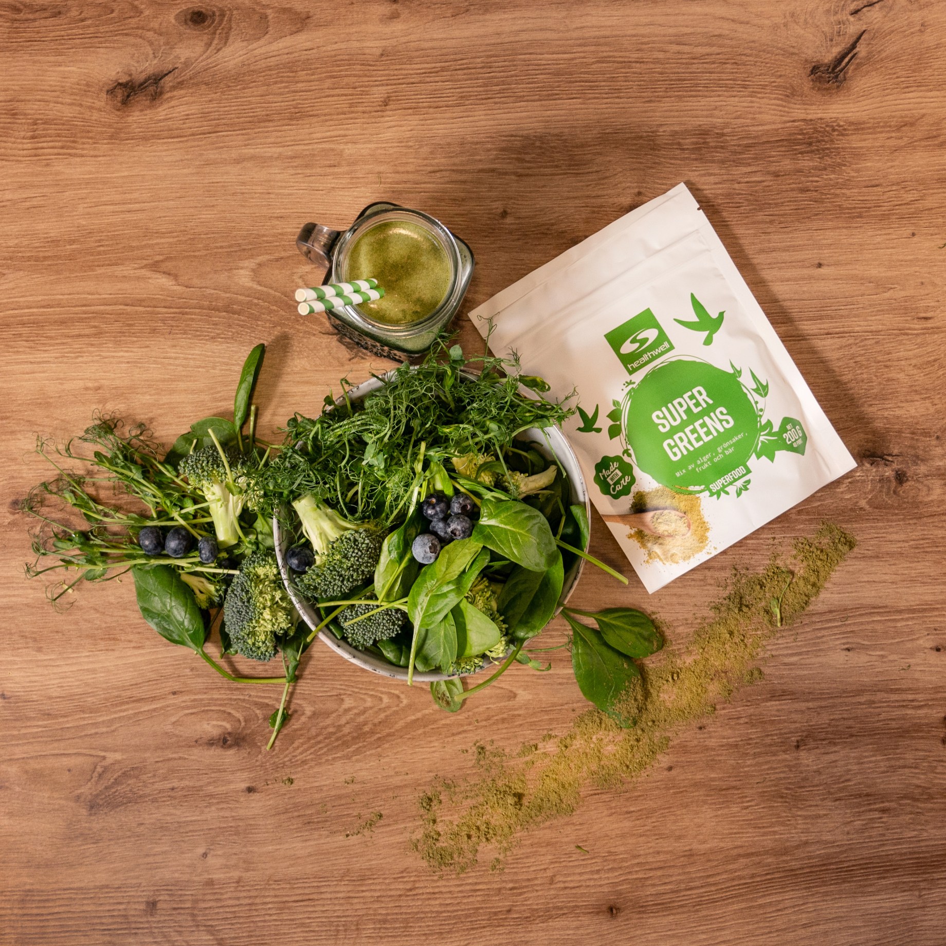 Super Greens från Healthwell innehåller en näringsrik blandning av bladgrönsaker, alger, bär och frön. Den är naturligt rik på A- och E-vitamin samt lutein, som är viktigt för ögats hälsa. Bland de viktiga antioxidanterna finns vitamin C, som skyddar kroppens celler mot oxidativ stress. Spirulina bidrar med flera vitaminer och mineraler, nyttiga fettsyror och en hög andel protein. Healthwell Super Greens innehåller också chlorella, en alg rik på klorofyll, samt gojibär, kända för sina höga halter av antioxidanter, mineraler och vitaminer. Dessutom finns fibrer från linfröpulver och chiafrömjöl som är bra för matsmältningen.