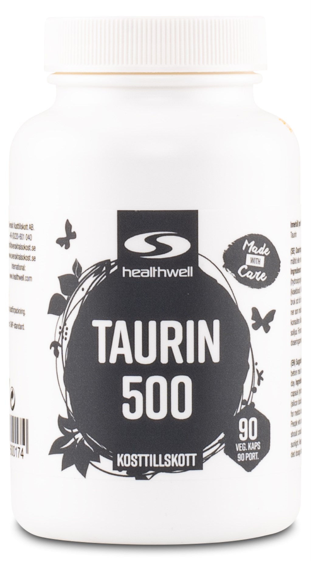 Healthwell Taurin 500 är ett veganskt kosttillskott som innehåller 500 mg taurin per kapsel. Taurin är en semi-essentiell aminosyra, vilket innebär att kroppen till viss del kan producera den själv. Vi får också i oss taurin genom animaliska livsmedel. Taurin är den vanligaste aminosyran i hjärtat och spelar en viktig roll i att reglera hjärtrytmen. Dessutom är den nödvändig för bildandet av gallsalter, som är viktiga för normal fettabsorption och upptaget av fettlösliga vitaminer.