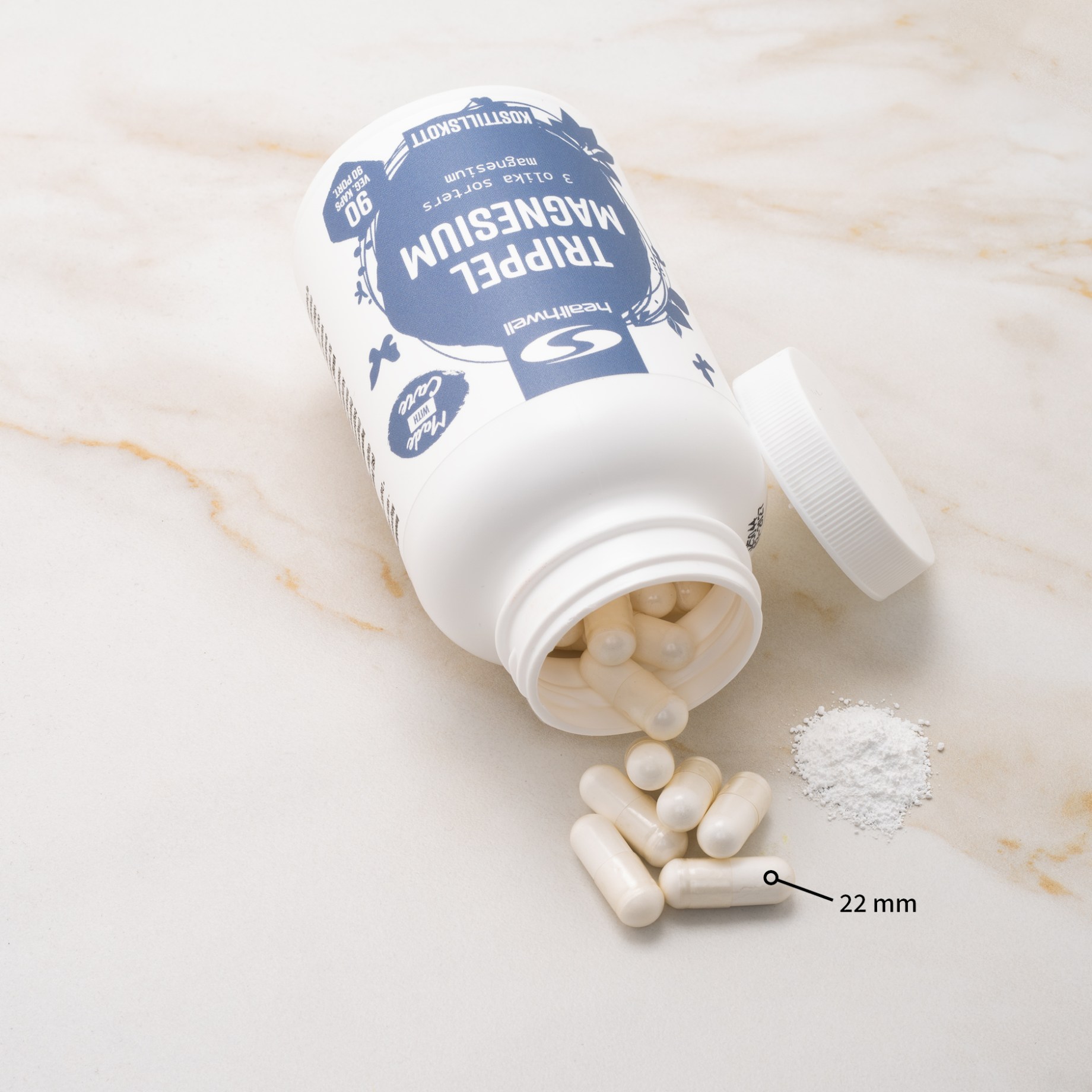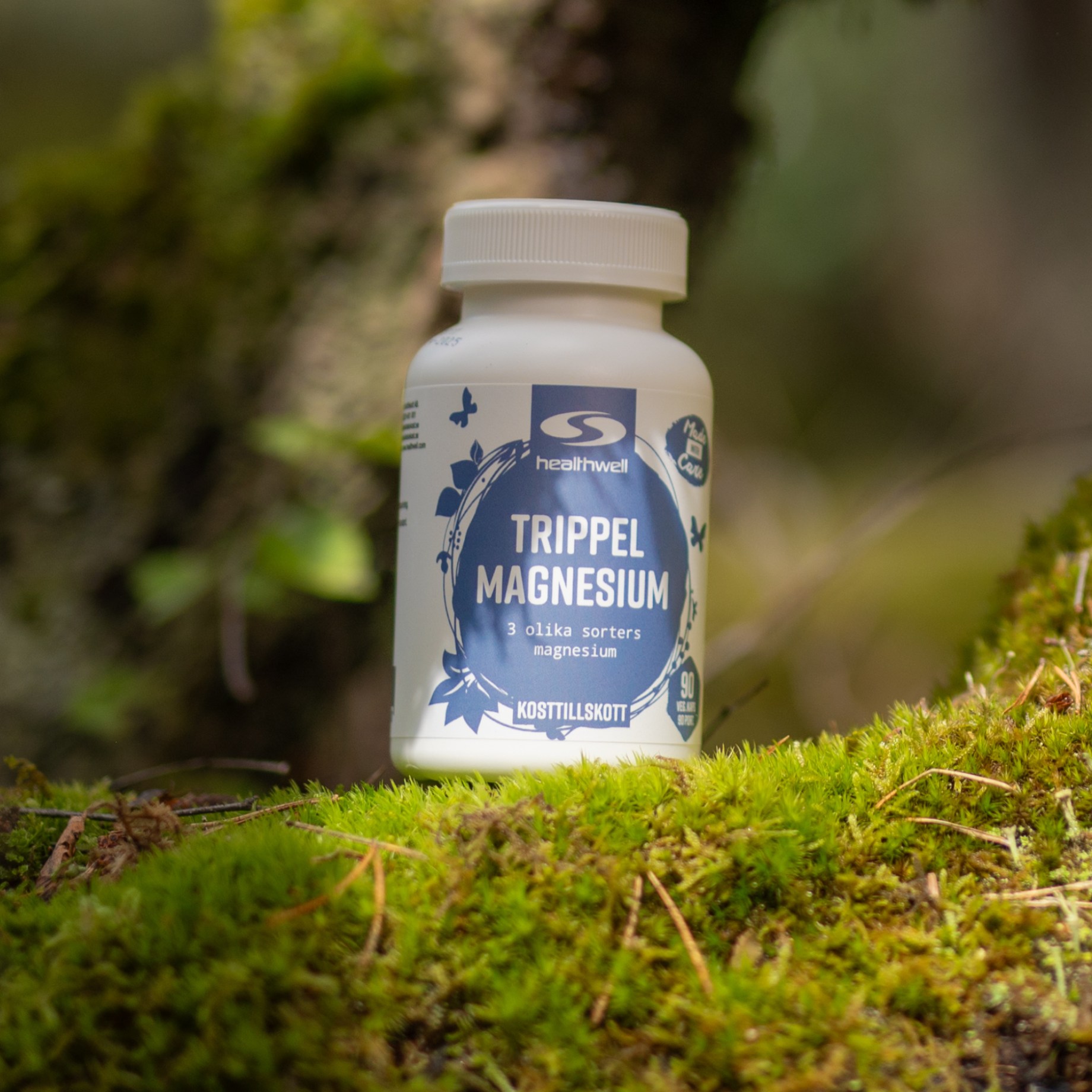 Healthwell Trippel Magnesium innehåller tre olika former av magnesium, vilket ökar kroppens förmåga att absorbera mineralet samtidigt som risken minskar för magbesvär vid högre intag.