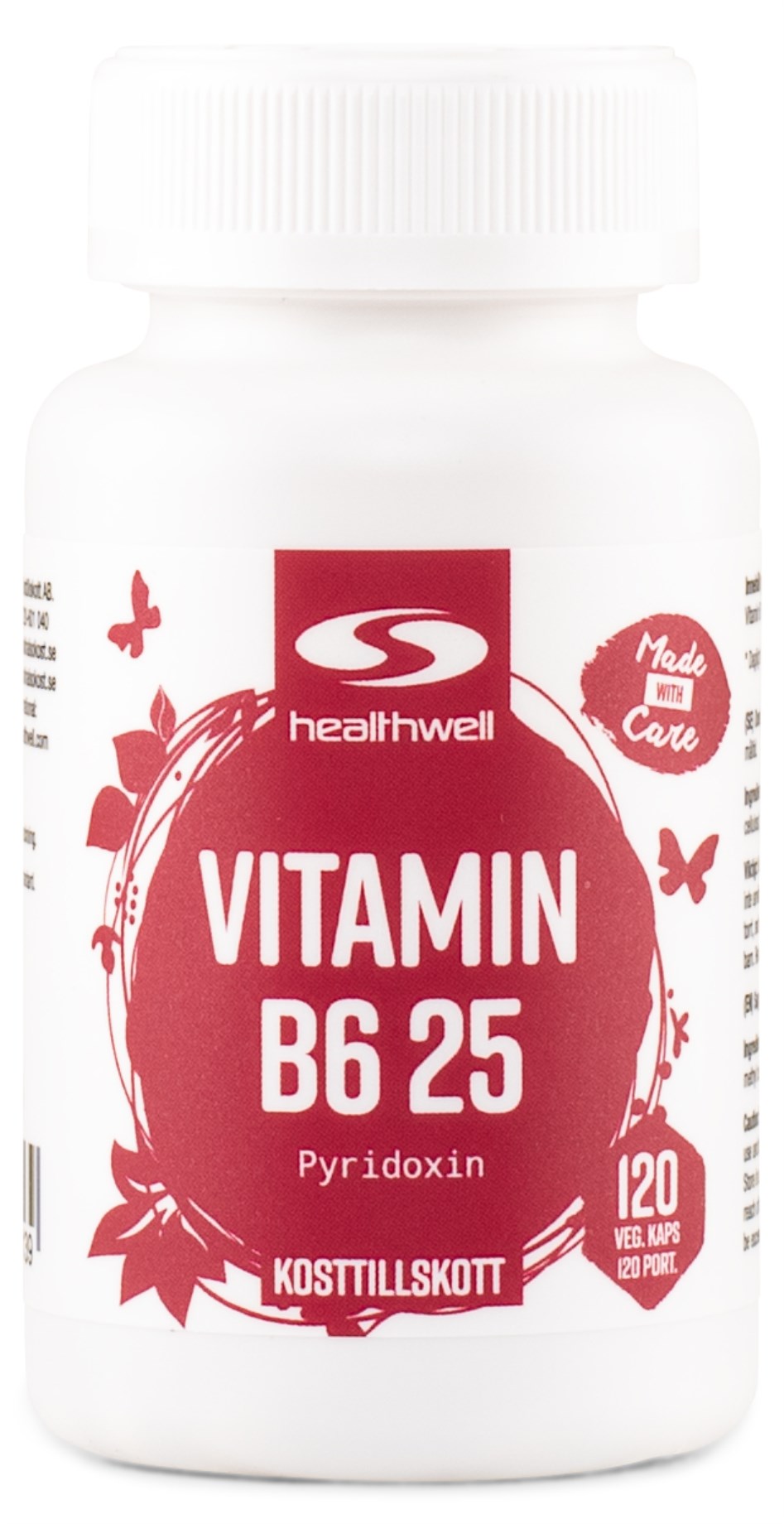 Healthwell Vitamin B6 25 är ett vegetabiliskt kosttillskott som innehåller 25 milligram lättupptagligt B6-vitamin per kapsel. B6-vitamin, även känt som pyridoxin, är ett vattenlösligt vitamin som spelar en avgörande roll i kroppens energiomsättning, bidrar till hormonreglering och hjälper till att minska trötthet och utmattning. Ta en kapsel dagligen i samband med måltid som ett komplement till en balanserad och hälsosam kost.