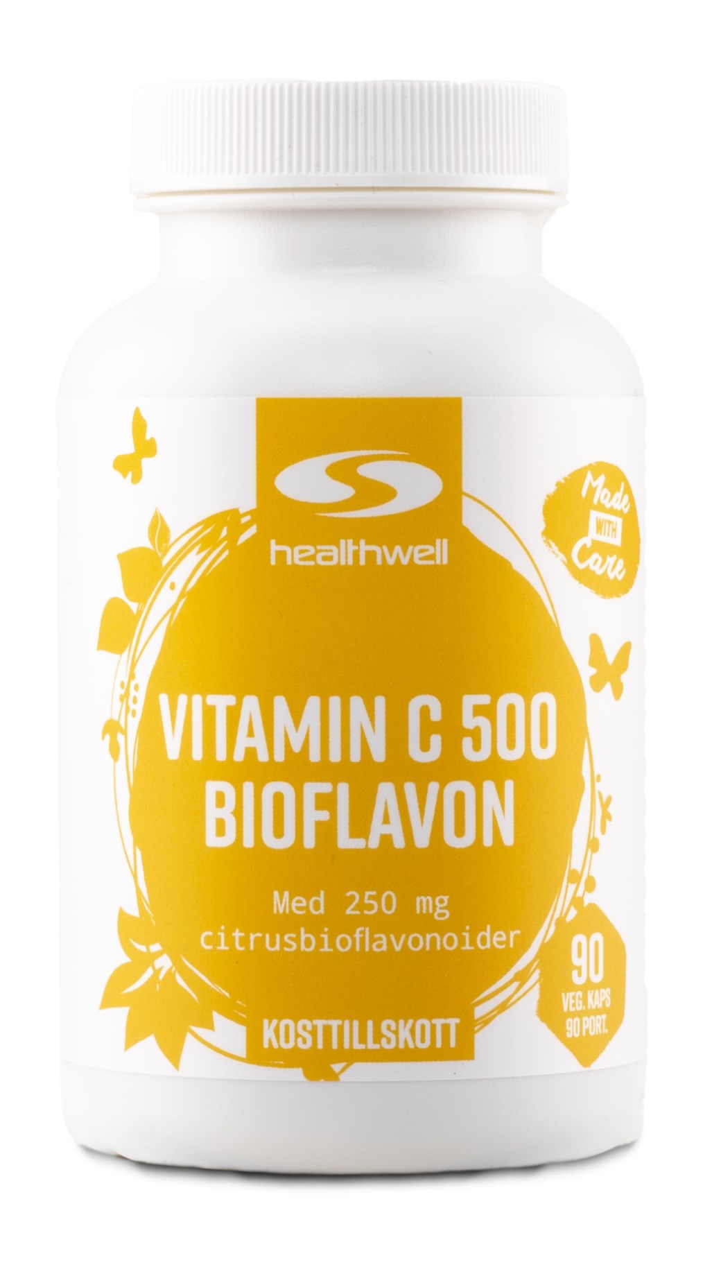 Healthwell Vitamin C Bioflavon är vegetabiliska kapslar som innehåller en hög koncentration av vitamin C och citrusbioflavonoider. Vitamin C är viktigt för kroppen och spelar en avgörande roll för immunsystemet som en kraftfull antioxidant som skyddar cellerna mot oxidativ stress. Det rika innehållet av citrusbioflavonoider, underlättar upptaget av vitamin C och förstärker dess effekter. Vitamin C är också nödvändigt för produktionen av kollagen, en viktig komponent för uppbyggnaden av brosk, och stödjer absorptionen av järn från maten.