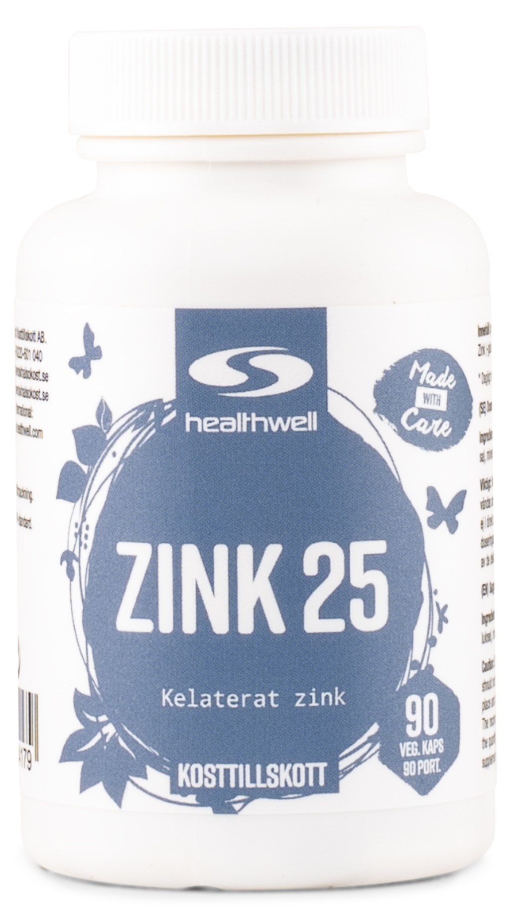 Healthwell Zink 25 är ett vegetabiliskt tillskott som innehåller 25 milligram zink per dos. Zink finns i alla kroppens celler, men har särskilt höga koncentrationer i ögon, hud, hår, naglar, hjärna, lever och njurar. Det är ett livsviktigt mineral som spelar en central roll för normal ämnesomsättning och immunsystemets funktion. Zinket i denna produkt är kelaterat, vilket innebär att det är bundet till en aminosyra. Detta förbättrar upptaget av zinket avsevärt jämfört med andra mineralformer.