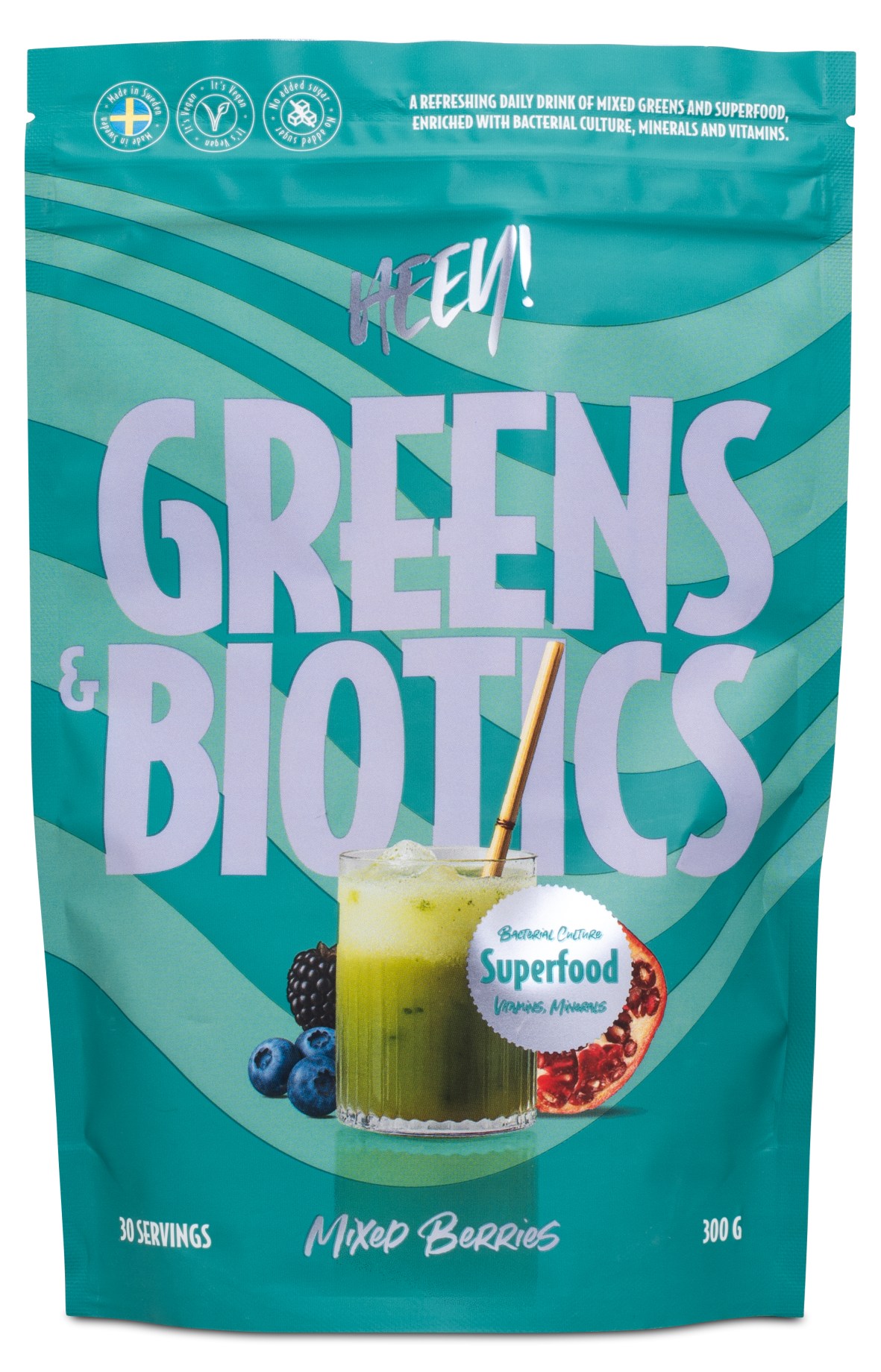 HEEY Greens & Biotics, Superfood + Probiotics är ett kosttillskott som ger en daglig näringskick med greens, prebiotika och probiotika. Grön blandning innehåller näringsrika ingredienser som spenat och spirulina och är rik på vitaminer, mineraler och antioxidanter som stödjer immunförsvaret. Den röda mixen består av bär och frukter med antioxidanter som skyddar mot fria radikaler. Inulin från cikoriarot förbättrar matsmältning och tarmflora genom att ge näring åt nyttiga bakterier, medan probiotikastammen Bacillus coagulans främjar tarmhälsan och matsmältningsfunktionen. Dessutom innehåller tillskottet viktiga vitaminer och mineraler, såsom zink och vitamin C, vilket bidrar till normal energiproduktion och immunsystemets normala funktion. Med en mild, naturlig sötma utan tillsatt socker, är detta veganska och svensktillverkade tillskott enkelt att blanda och njuta av varje dag.