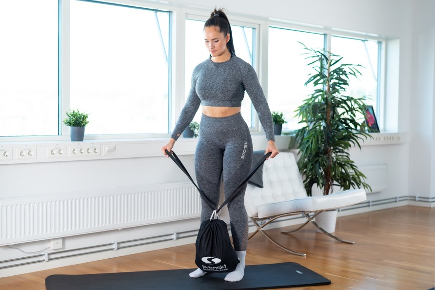Beroende på vad du har för motstånd på gummibandet och hur mycket du fyller din stringbag kan du köra allt mellan 10-15 repetioner x 4 set. Tycker du att det är för lätt, ta ett gummiband med mer motstånd, lägg i mer vikt i stringbagen eller kör ett till set. Oavsett övning ska du tänka på hållningen, rulla bak axlarna, lätt fram med bröstet och ha lätt spänning i bålen.