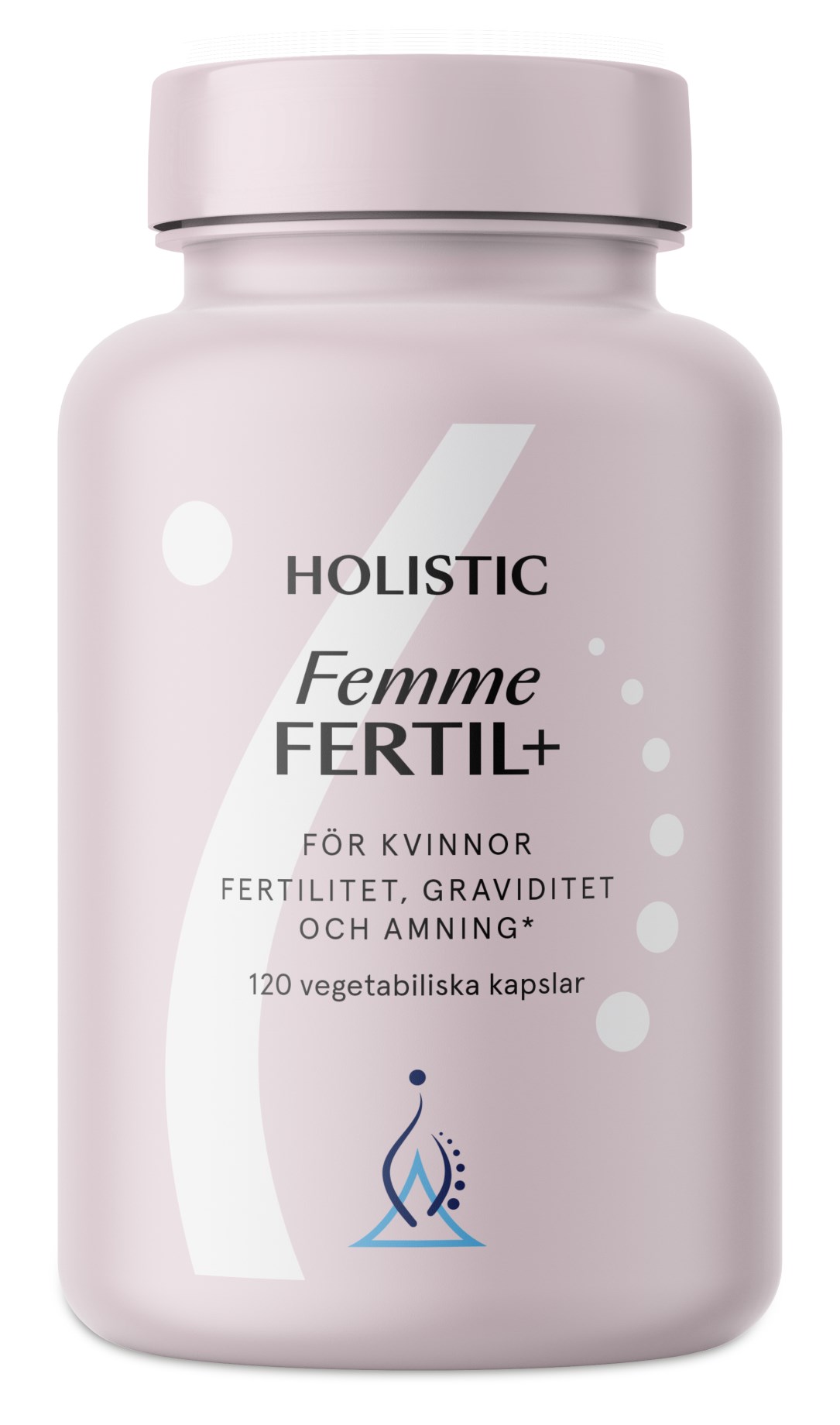 Holistic Femme Fertil+ är ett heltäckande kosttillskott särskilt utformat för kvinnor och innehåller vitaminer och mineraler för att främja fertilitet och ge näring både före, under och efter graviditeten. Femme Fertil+ är utvecklad med målet att förbättra hälsa och näringsstatus under denna viktiga period i livet. Innehållet består av noggrant utvalda vitaminer och mineraler som är skonsamma mot magen och lätt tas upp av kroppen.