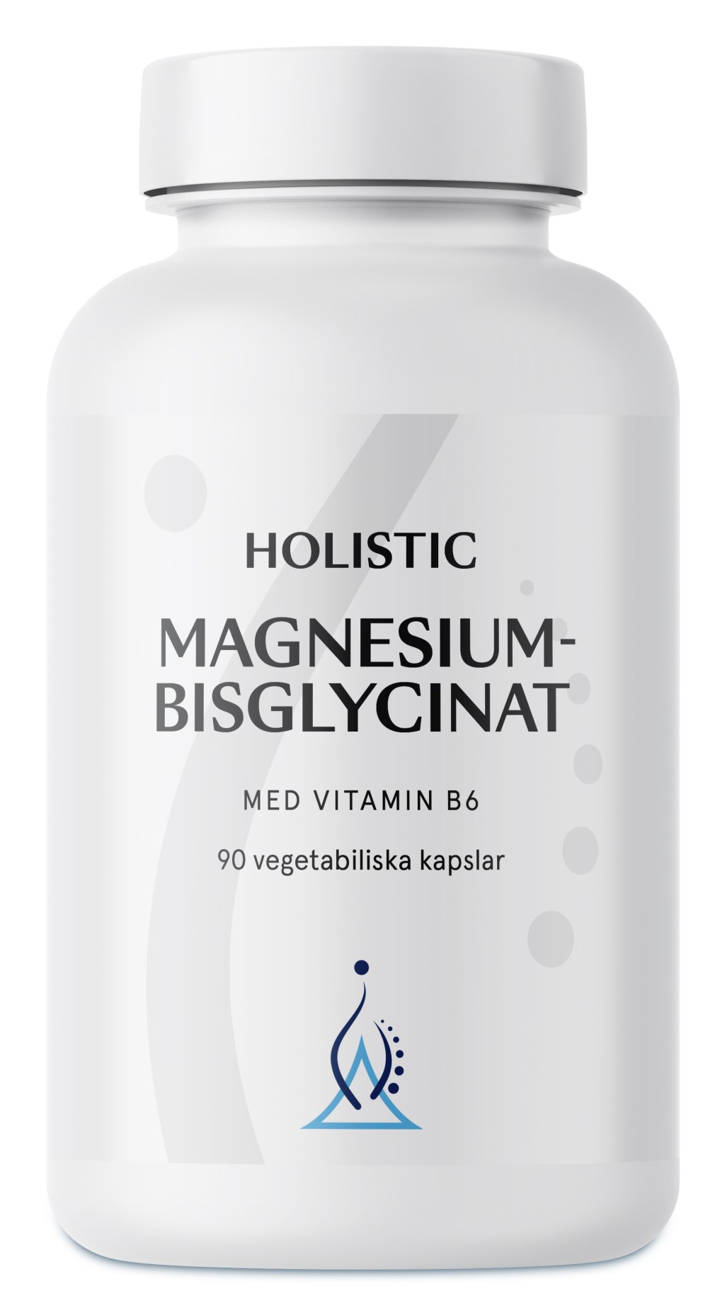 Holistic Magnesiumbisglycinat är ett magnesiumtillskott som innehåller magnesiumbisglycinat i kombination med den aktiva, metylerade formen av vitamin B6. Produkten är baserad på ren, obuffrad magnesiumbisglycinat tillsammans med vitamin B6. Dessa näringsämnen bidrar till att minska trötthetskänslor, samtidigt som de stödjer nervsystemets normala funktion.