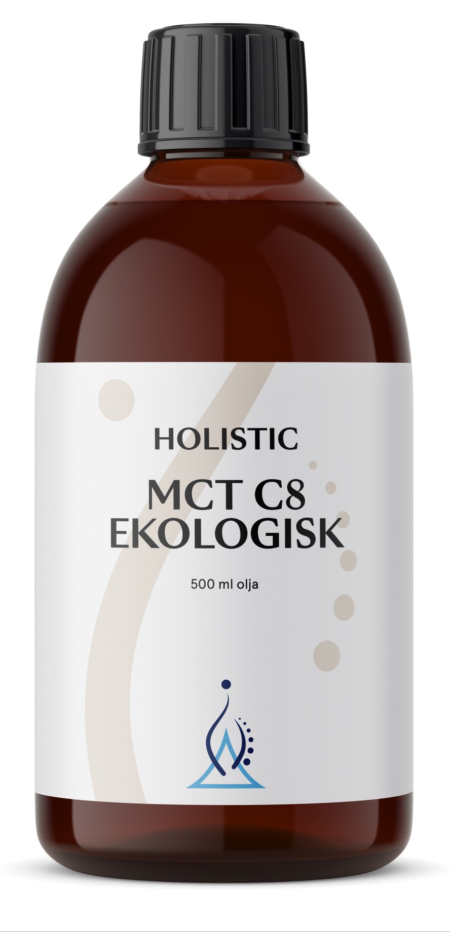 Få en stabilare energinivå och ökad mättnadskänsla med Holistic MCT C8 Eko, en MCT-olja med hela 95 % kaprylsyra (C8). Oljan består av MCT från ekologisk kokosolja, alltså medium chain triglycerides, som är medellånga mättade fettsyror som från tunntarmen snabbt tas upp i blodet. Det ger i sin tur snabb energi samt en mer stabil energinivå när du tränar. Bland sportutövare är MCT-olja populär, men den passar även dig som äter en lågkolhydratkost, då oljan är ketogen, samt dig som äter enligt paleodieten. Den reglerar även aptiten när ökad mättnadskänsla önskas. Holistic MCT C8 Eko är helt smaklös och passar perfekt i kaffet eller i smoothien. Helt vegansk!