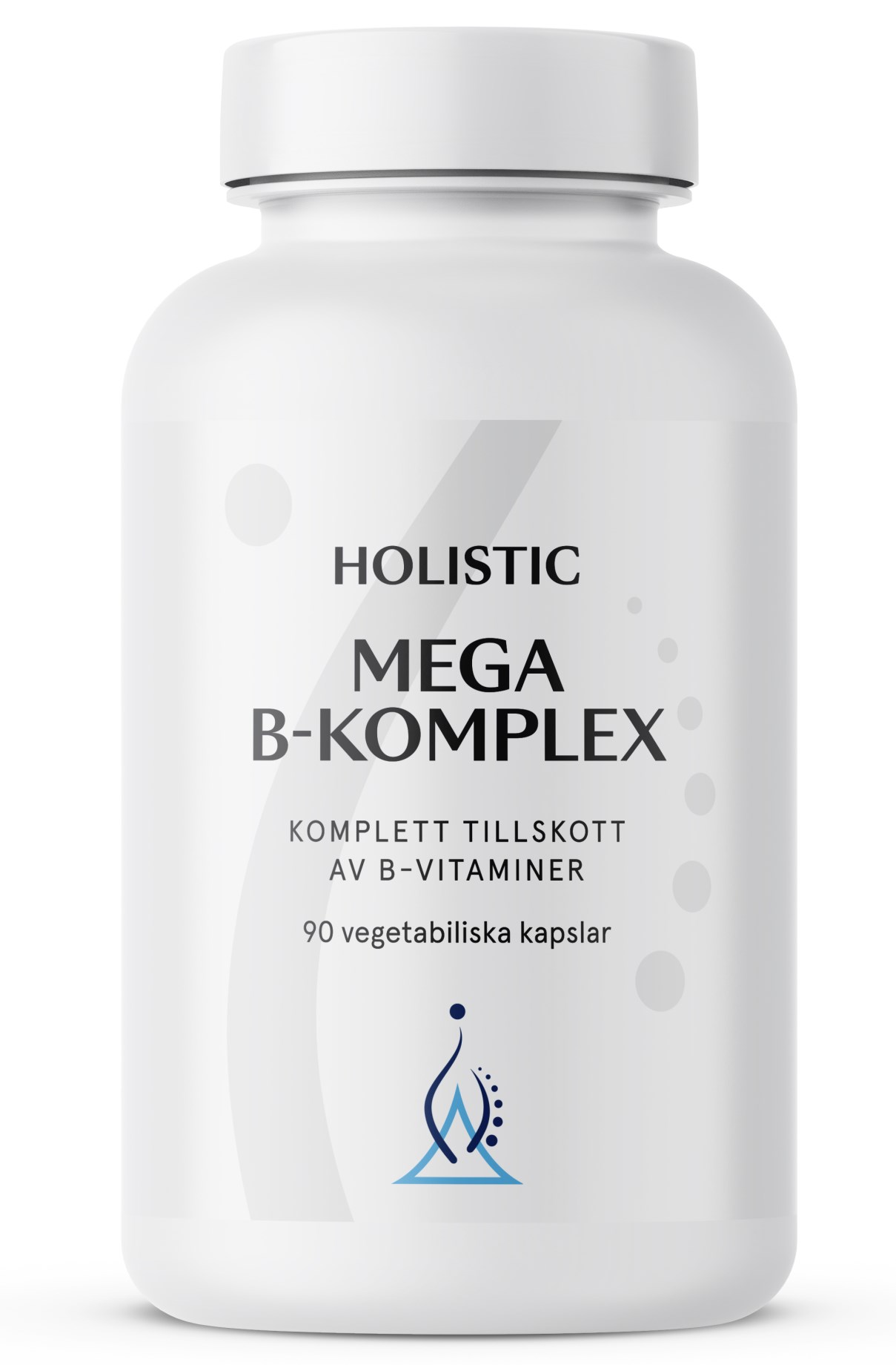 Holistic Mega B-komplex är ett kosttillskott med alla B-vitaminer samt inositol, kolin och PABA, helt utan jäst. Det ger en dagsdos av B-vitaminer i en enda kapsel, som stödjer normal energiomsättning, psykologisk funktion samt nervsystemets normala funktion. Under stressiga perioder och vid dålig kost kan behovet av dessa vitaminer öka. Tiamin bidrar till hjärtfunktionen, medan riboflavin stödjer järnomsättningen och skyddar cellerna mot stress. Vitamin B6, B12 och folat bidrar till immunsystemets funktion och minskar trötthet. Produkten är 100 % vegansk och burkarna är gjorda av 96 % biobaserad plast.