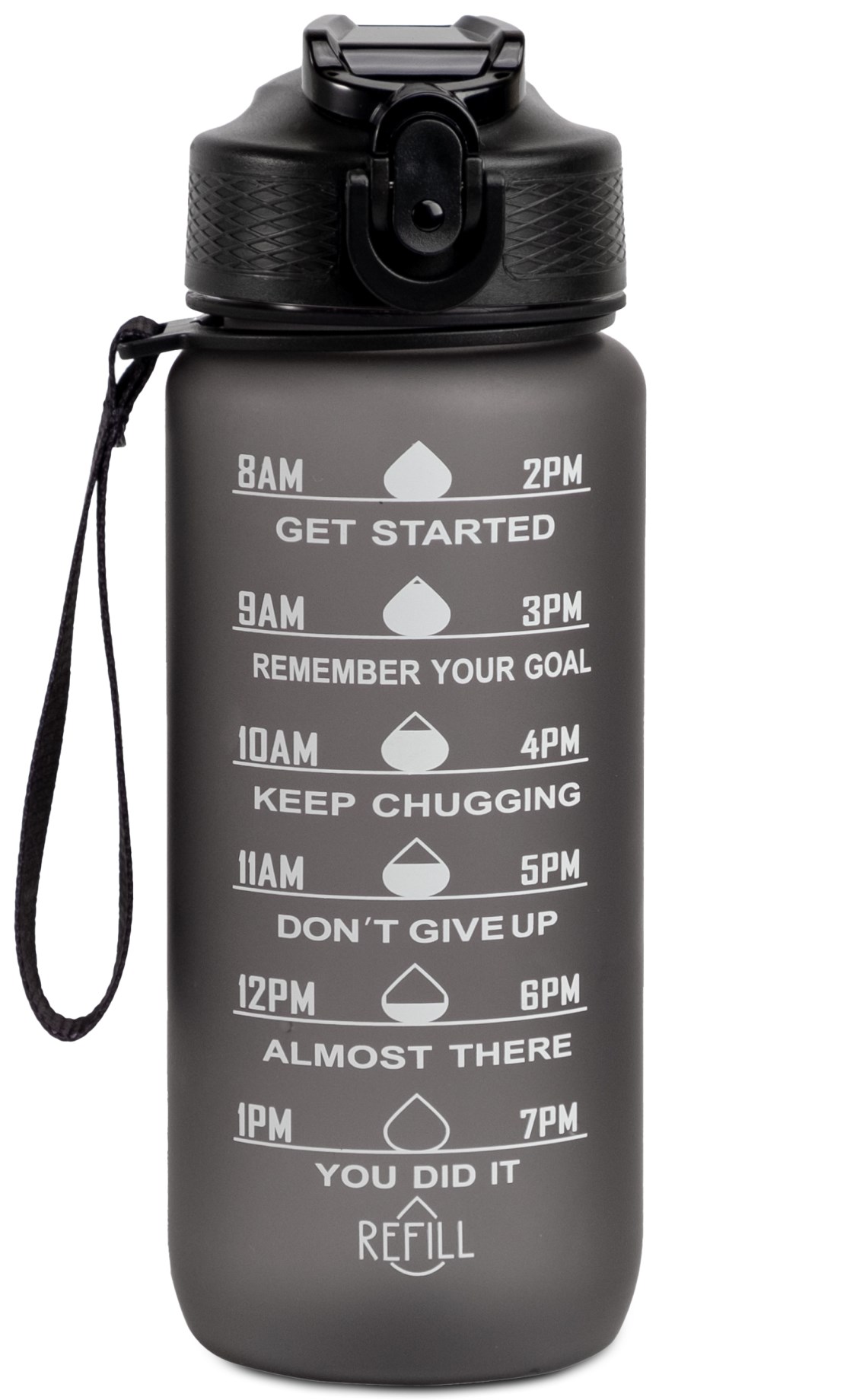 Hollywood Motivational Bottle är en vattenflaska som rymmer 1 liter och som har smarta tidsmarkörer för att enkelt hålla koll på ditt vätskeintag under dagen. Flaskan är utrustad med ett uppfällbart sugrör och är läckagesäker. Den tål både varma och kalla drycker. Flaskan kan tvättas i diskmaskin upp till 100 grader, men handtvätt rekommenderas för att säkerställa att färgen håller. Hollywood Motivational Bottle är vattenflaskan som gör vätskeintaget roligare! Perfekt för skola, träning, jobb eller på resor.