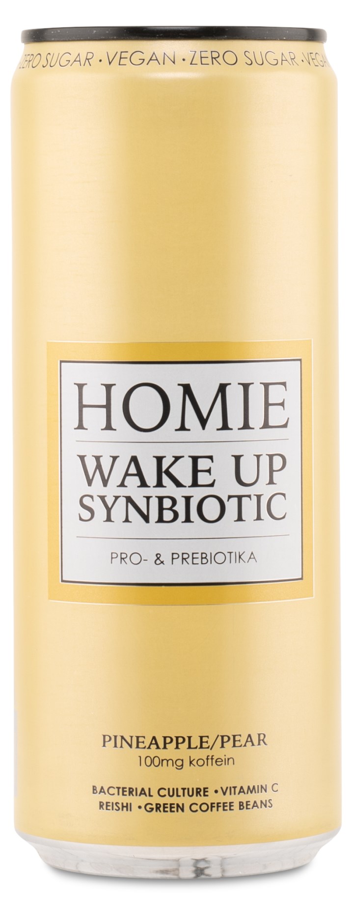 Få ny energi med Homie Wake Up Synbiotic, en kolsyrad energidryck som innehåller 100 mg naturligt koffein, från gröna kaffebönor, per burk. Koffein bidrar med ökad vakenhet och ökad koncentration. Förutom koffein innehåller drycken levande bakteriekultur och noga utvalda vitaminer och mineraler för en glad mage. Den är även berikad med reishi (lackticka) och cikoriarotfiber. Finns i flera smaker och är en perfekt dryck för jobbet, skolan eller träningen!