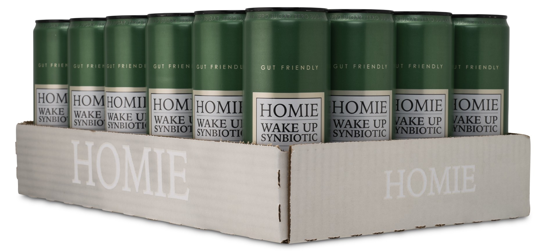 Få ny energi med Homie Wake Up Synbiotic, en kolsyrad energidryck som innehåller 100 mg naturligt koffein, från gröna kaffebönor, per burk. Koffein bidrar med ökad vakenhet och ökad koncentration. Förutom koffein innehåller drycken levande bakteriekultur och noga utvalda vitaminer och mineraler för en glad mage. Den är även berikad med reishi (lackticka) och cikoriarotfiber. Finns i flera smaker och är en perfekt dryck för jobbet, skolan eller träningen!
