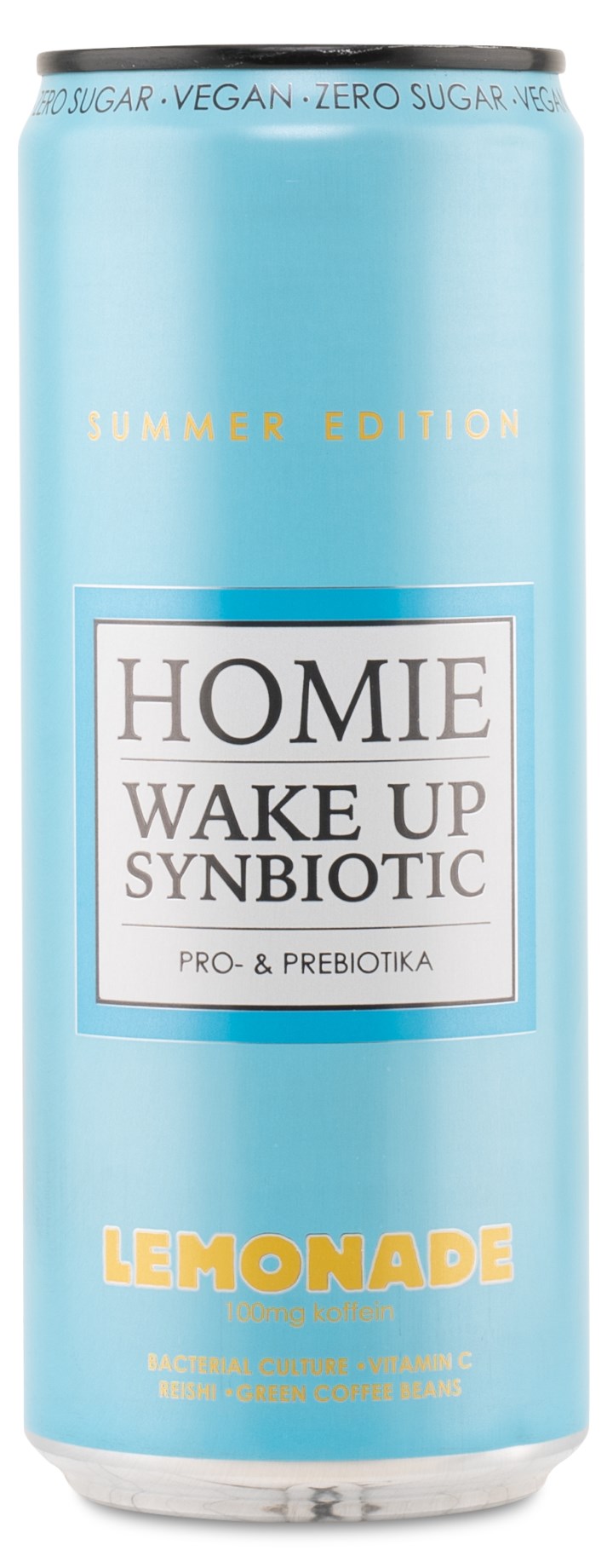 Få ny energi med Homie Wake Up Synbiotic, en kolsyrad energidryck som innehåller 100 mg naturligt koffein, från gröna kaffebönor, per burk. Koffein bidrar med ökad vakenhet och ökad koncentration. Förutom koffein innehåller drycken levande bakteriekultur och noga utvalda vitaminer och mineraler för en glad mage. Den är även berikad med reishi (lackticka) och cikoriarotfiber. Finns i flera smaker och är en perfekt dryck för jobbet, skolan eller träningen!