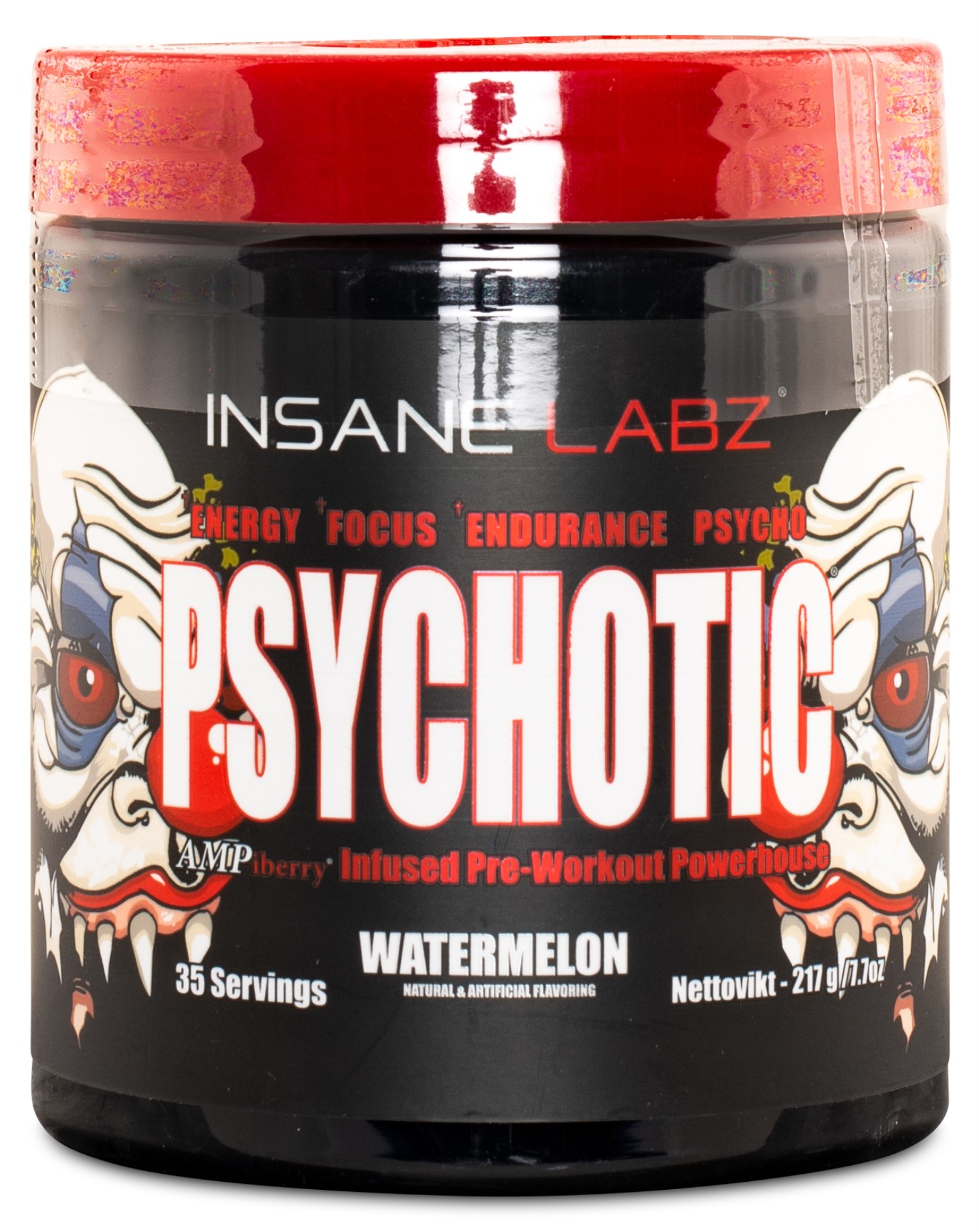 Insane Labz har skapat en riktig powerdrink för den som vill ge 110% på gymmet - Psychotic Pre-Workout! Denna högdoserade PWO är utformad för att intas före träning och det höga koffeininnehållet på hela 400 mg per portion ger dig en uppiggande effekt - perfekt för att ge dig extra muskeluthållighet när du utför utmanande träningspass. Psychotic Pre-Workout innehåller även en mängd andra aktiva ingredienser, såsom Cocoteanol, AMPiberry, Cordyceps och Centella Asiatica, tillsammans med klassiska tillskott som beta-alanin och kreatin. Tillsammans skapar de en explosiv cocktail av energi och uthållighet som får dig att prestera på topp. Så om du vill ta din träning till en helt ny nivå och känna dig starkare och mer uthållig än någonsin tidigare, börja med en halv skopa av denna häftiga PWO och känn effekten!