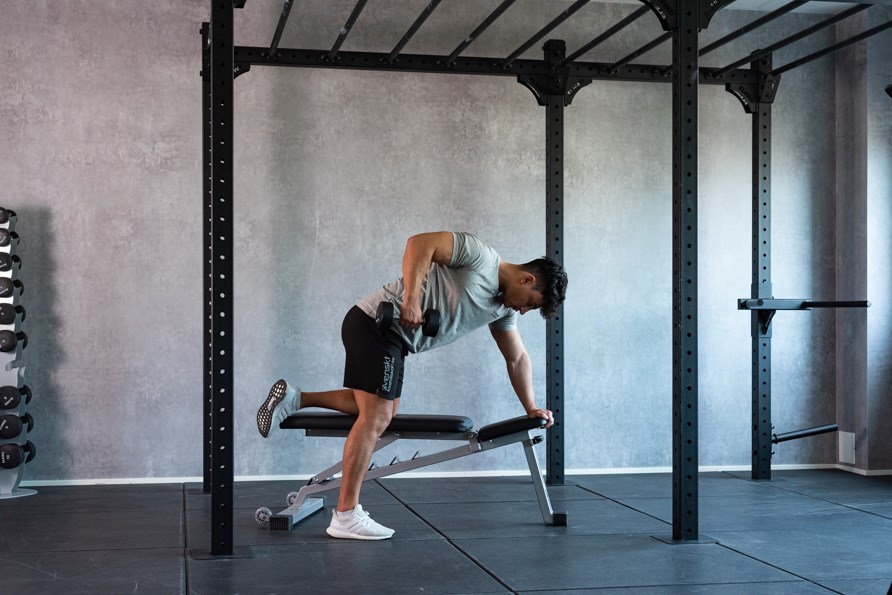 1. Placera höger knä och handflata på en bänk, armen på bänken ska vara under axeln och helt rak.