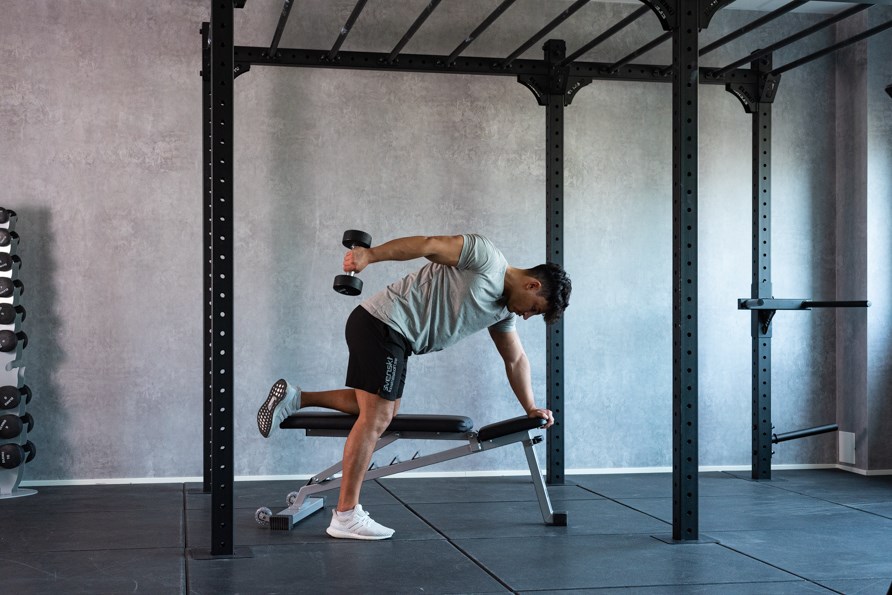 3. Lyft upp armen som håller i en hantel så att överarmen är parallell med överkroppen, håll armbågen intill kroppen, lite bakom din rygg i höjd.