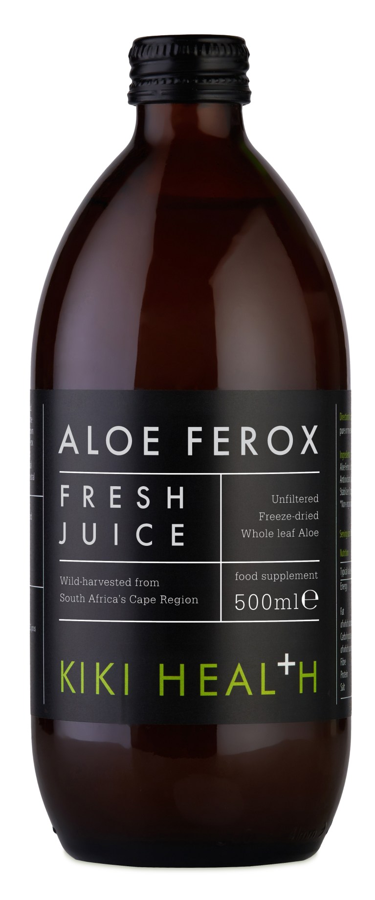 Kiki Health Aloe Ferox Juice är en juice av Aloe Ferox-plantan, en robust växt från den vilda miljön i Cape-regionen i Sydafrika. I mer än 200 år har växten använts i renande syfte. Aloe Ferox-plantan producerar 20 gånger mer bitter saft än den mer kända Aloe Vera-plantan. Då dess blad dessutom är starkare kommer inte ämnet aloin in i juicen. Det gör i sin tur att juicen varken behöver spädas ut eller filtreras, vilket gör att alla naturliga ämnen finns kvar. Okoncentrerad och outspädd!