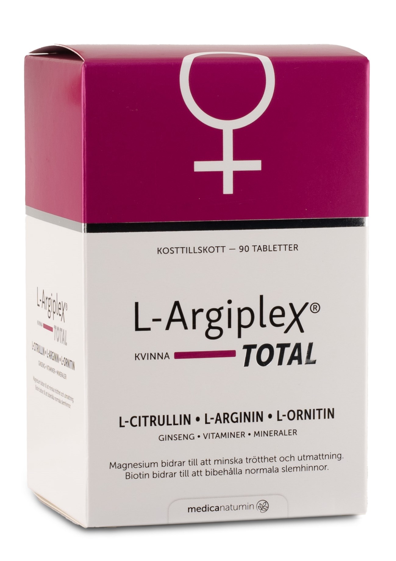 L-Argiplex Total Kvinna (l'argiplex) är en uppdaterad variant av det populära kosttillskottet L-Argiplex Kvinna. L-Argiplex Total Kvinna är ett komplex av utvalda verksamma ämnen, däribland aminosyrorna L-citrullin, L-arginin och L-ortnitin som utgångspunkt. Även extrakt från ginseng samt flera vitaminer och mineraler är tillsatta. L-Argiplex Total Kvinna har blivit utsedd till Årets energiboost i Swedish Health Awards 2017.