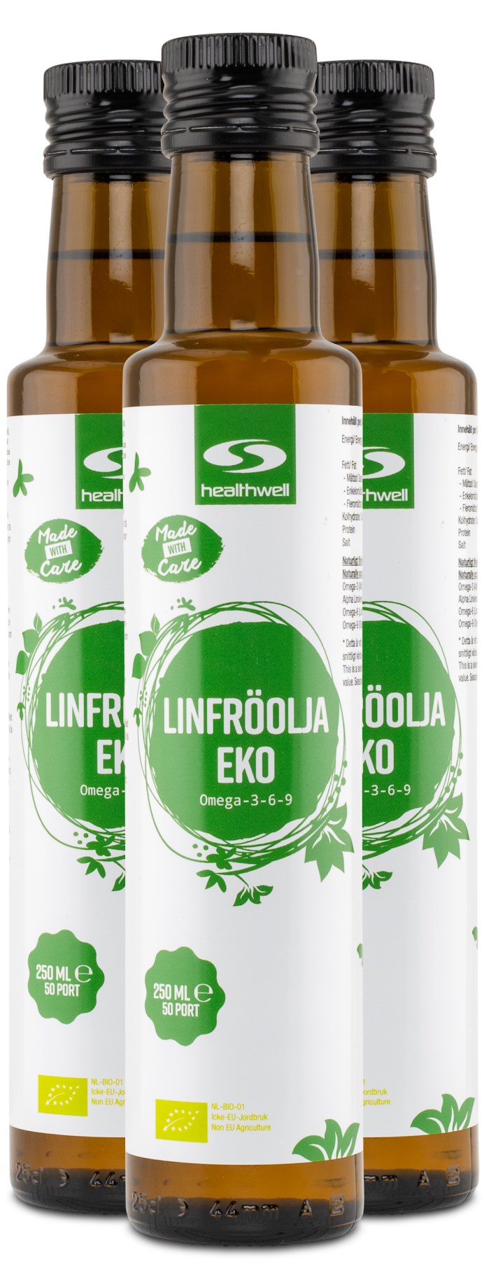 Healthwell Linfröolja EKO är en ekologiskt certifierad linfröolja. Den kallpressade oljan kommer från linfrön som varsamt pressats utan värme eller tillsatta kemikalier, vilket bevarar dess näringsämnen bättre. Linfröolja gör sig lika bra som ett dagligt tillskott av nyttiga fettsyror som till ett hälsosammare supplement till salladen. Linfröolja är naturligt rik på omega-3 som annars återfinns främst i fet fisk. Healthwell Linfröolja EKO är helt vegetabilisk och passar dig som äter vegetariskt eller plantbaserat och vill ha ett enkelt sätt att tillföra de viktiga fettsyrorna. Läs mer om linfröolja.