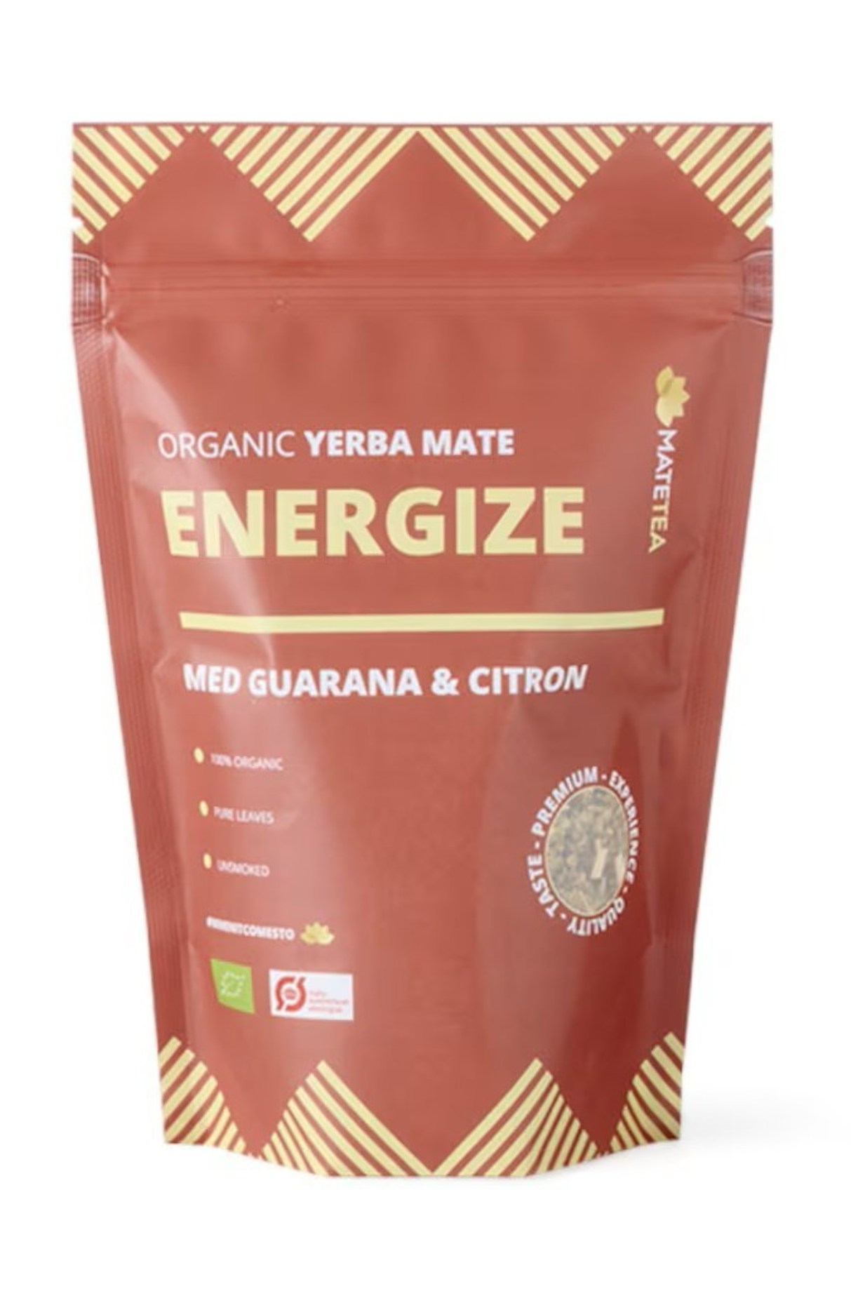 Matetea Yerba Mate Energize med en sötsyrlig smak av citrongräs och guarana. Guarana är en naturlig källa till koffein och är perfekt att starta på din morgonrutin eller under hektiska arbetsdagar. Med 90 mg koffein per kopp.