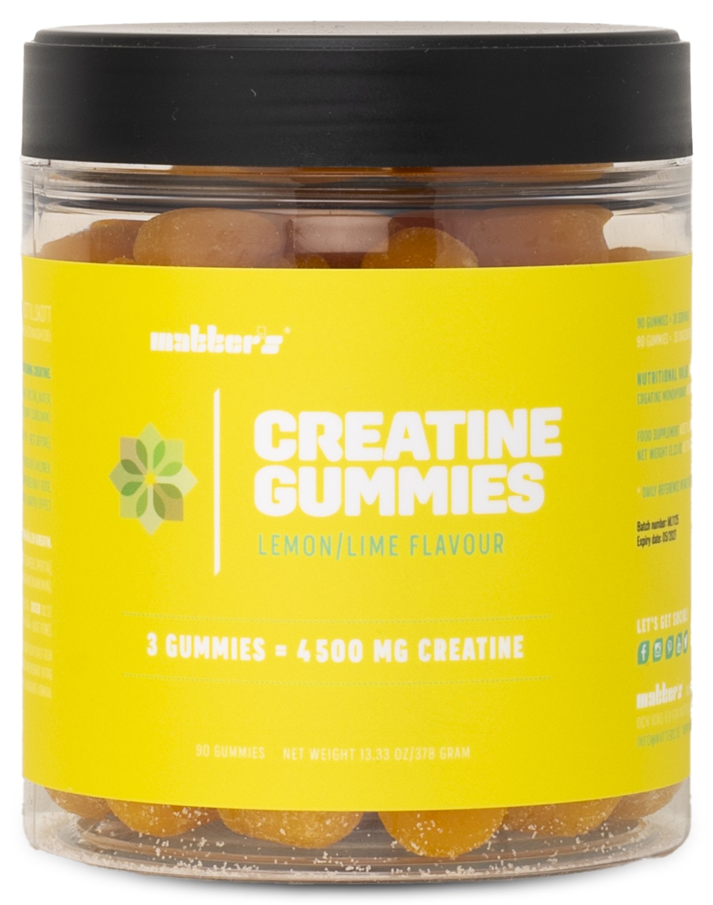 Matters Creatine 4500 mg är sockerfria gummies med rent kreatinmonohydrat. De har en söt smak för ett välsmakande sätt att inta ditt kreatin på. De är enkla att ta med sig i träningsväskan eller på resan. Tre stycken gummies per dag ger dig en dagsdos på 4500 mg rent kreatinmonohydrat. Naturliga smak- och färgämnen samt helt fria från socker. Dela upp dosen under dagen för att stilla sötsuget, eller ta hela dosen på morgonen.