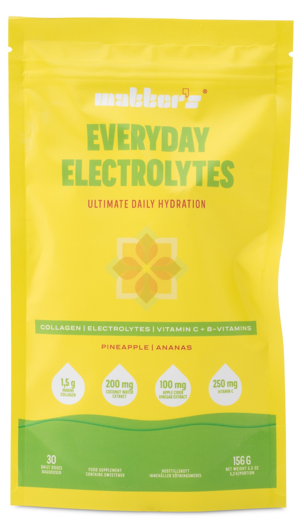 Matters Everyday Electrolytes är en specialformulerad elektrolytmix för dig som vill säkerställa en normal vätskebalans, både under träning och varma sommardagar. Denna unika blandning innehåller mineraler såsom natrium, kalium, kalcium och magnesium från naturligt havssalt samt närande kokosvattenextrakt. Förutom viktiga elektrolyter innehåller den även marint kollagen, C-vitamin, hyaluronsyra och biotin för att ge näring till hår, hud och naglar. Berikad med äppelcidervinäger och inulin från cikoriarot för att stödja en normal tarmflora. Naturligt smaksatt och sötad utan konstgjorda tillsatser. Varje paket kommer med en skopa för enkel dosering.