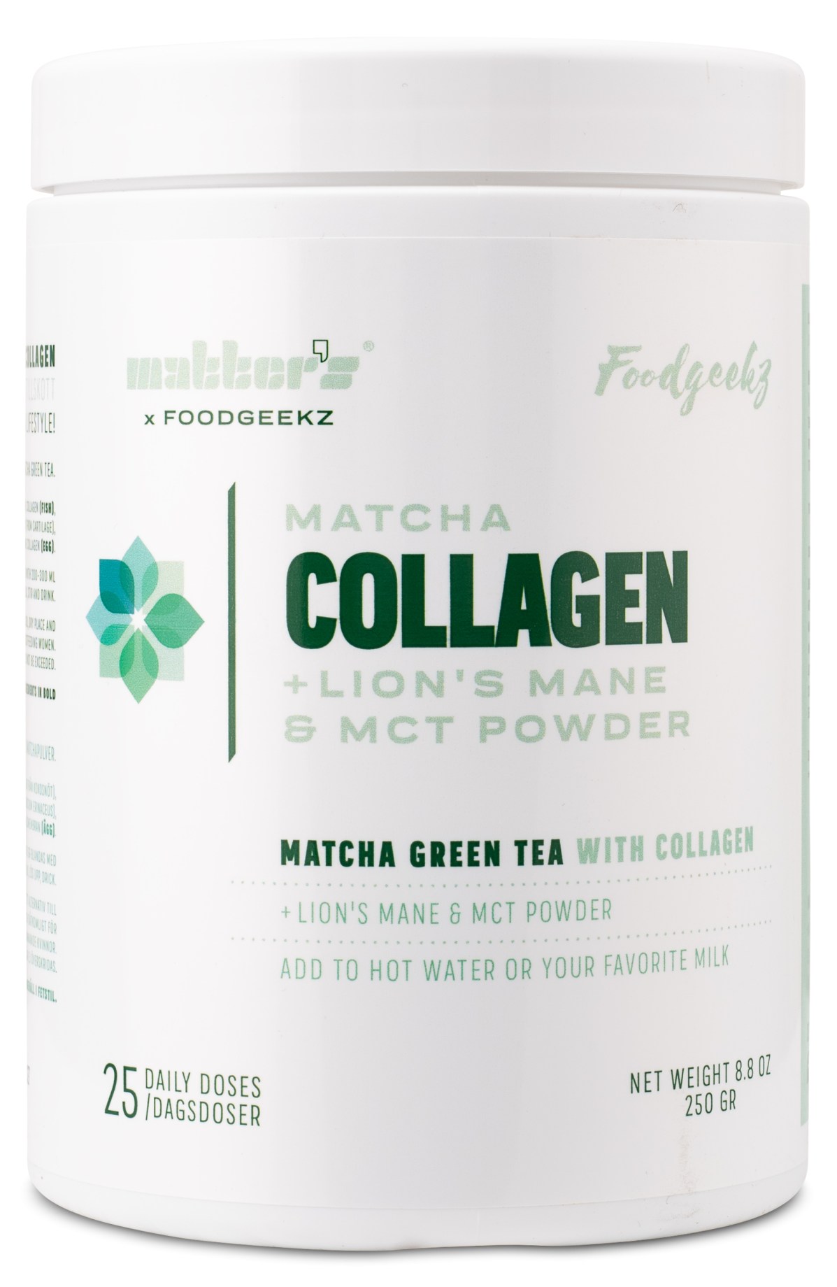 Matters Matcha Collagen är en blandning av kollagen och ekologiskt japanskt grönt matcha-te som är rikt på aminosyror och antioxidanter. Pulvret innehåller kollagentyperna 1, 2, 3, 5 och 10. Även tillsatt Lion's Mane och MCT-pulver från kokosnötter. Blanda pulvret med hett vatten eller valfri mjölk och njut av en god matchalatte! Passar även bra i smoothies eller bakverk. Fritt från konstgjorda sötningsmedel, gluten och GMO. Framtagen i samarbete med @Foodgeekz.se.