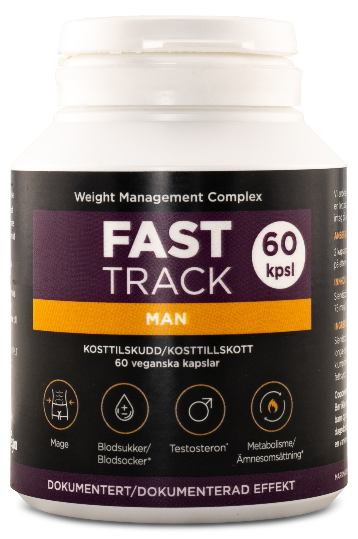 Medica Natumin Fast Track Man är ett naturligt komplex som är framtaget för att verka som en del i en viktminskningskur hos män. Tillskottet innehåller det synergistiska komplexet Slendacor med botaniska extrakt från gurkmeja, curry- och pepparrotsblad som alla har dokumenterade egenskaper. Det innehåller även vitamin B6 som bidrar till normal ämnesomsättning av protein och kolhydrater, samt zink som bidrar till att bibehålla normala testosteronnivåer i blodet. Krom bidrar till att upprätthålla normala blodsockernivåer. Doseringen är 1 kapsel två gånger dagligen i samband med måltid.